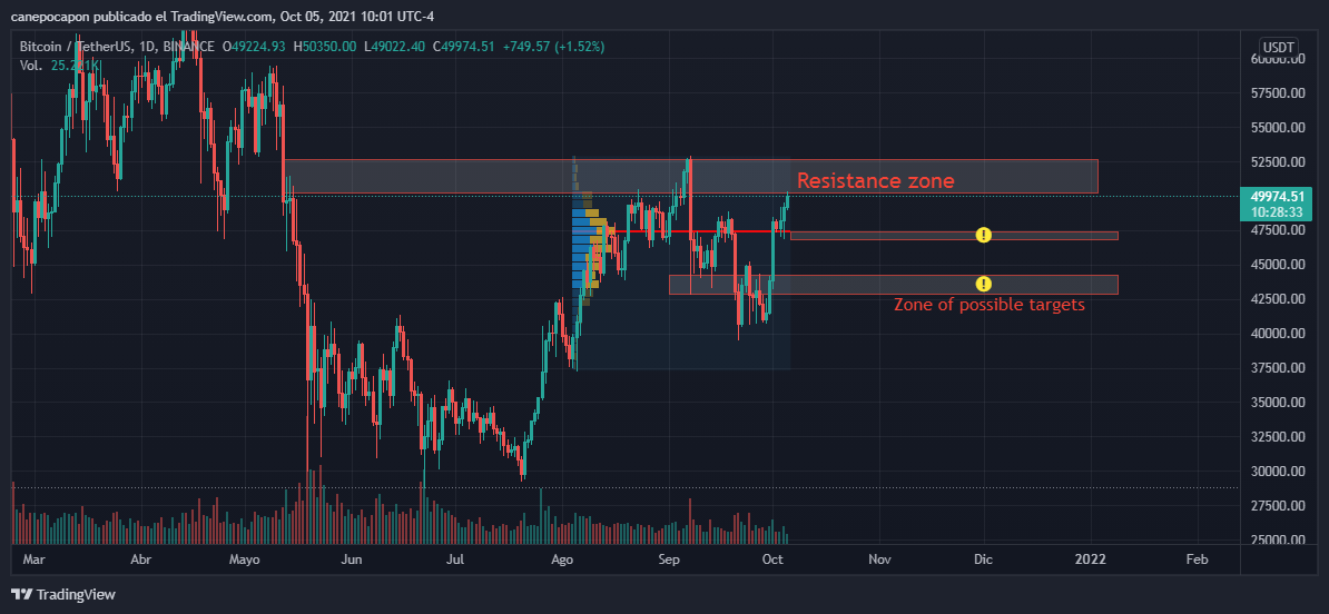 The world's most popular cryptocurrency registers a resistance zone that is being tested for the second time and could be an area to look for sales at 47K or 43-41K levels.