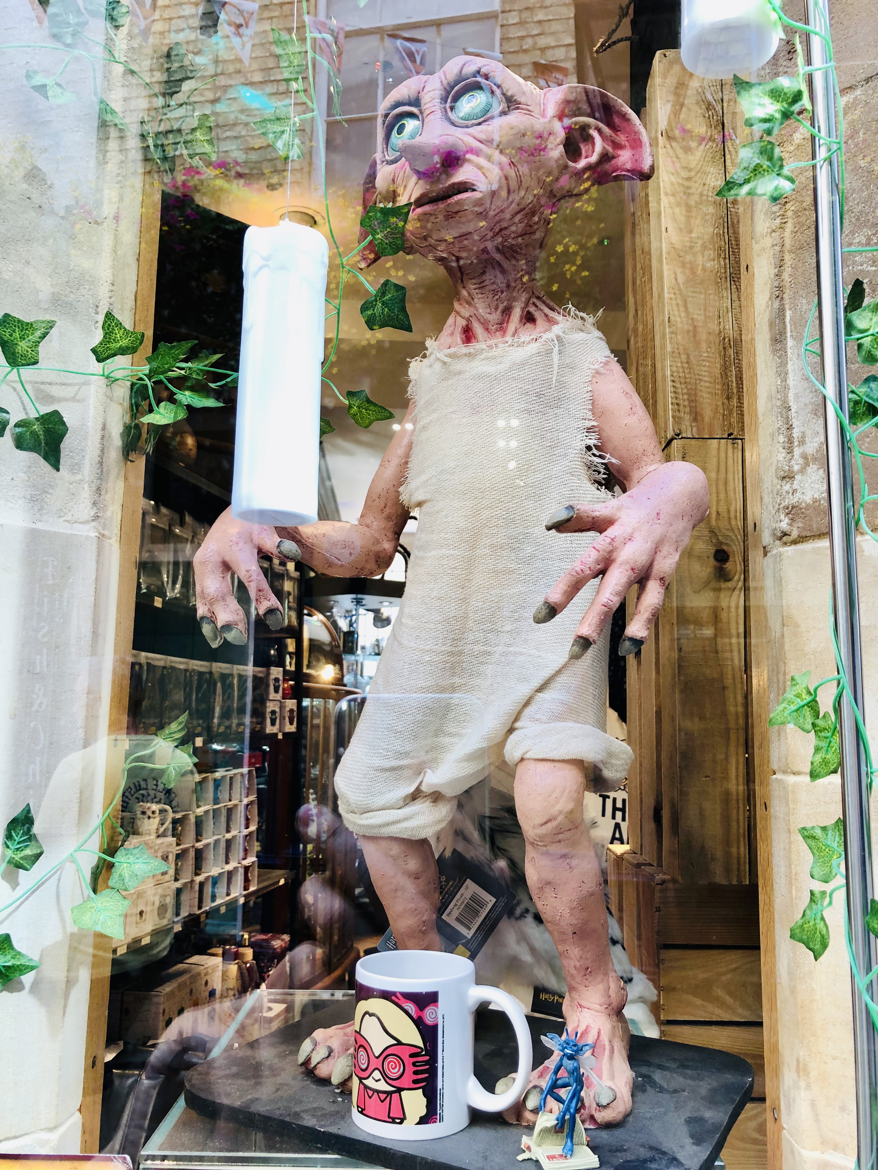 The window display inside and out with Dobby, the free elf. My children are Harry Potter fans! 🧙🏻♀️