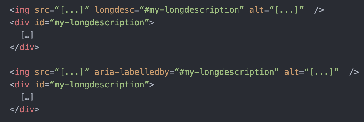 The long description is a secondary means by which to associate another element as the description of the image. This is commonly replaced now by the aria-labelledby feature which functions in the same way but has better support across browser and assertive technologies and can be assigned to more than just images. It works by informing the user the ID of another element on the page as the intended description.