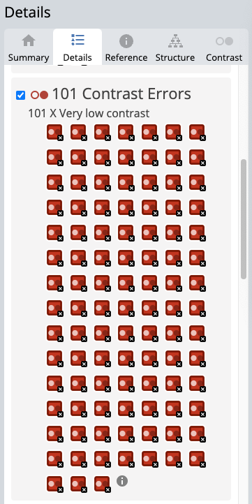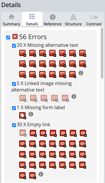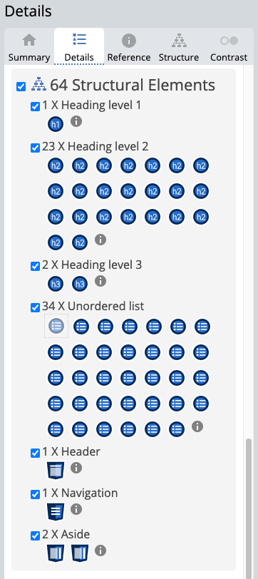 On this tab, we are presented with a breakdown of each of the 6 sections covered by the Summary view. The points are listed vertically and broken down into groups with associated subheadings and an icon for each instance. This icon is interactive so we can use it to highlight the specific issue in our preview plane and scrolls us to the part of the page where the instance occurs.