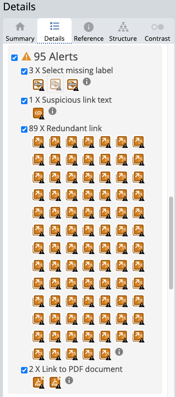 Links to PDFs may seem odd as an alert, all that is happening here is PDFs can be accessible but often are not unless the author of the PDF makes it so, this is used to help encourage authors to make sure supplemental material is also accessible and if not, then to try to source accessible alternatives.