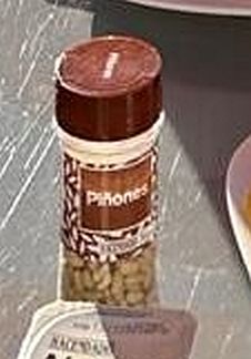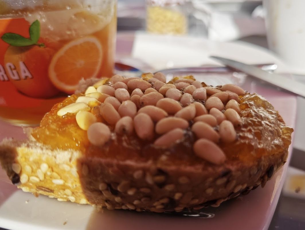 Auf dem Brötchen hab ich natürlich bestes Olivenöl unter der Naranja Marmelade. Bestreut hab ich das Ganze mit Pinienkernen, die man hier in jedem Mercadona bekommt. Das Döschen ist oben im Bild vom Frühstückstisch zu sehen.