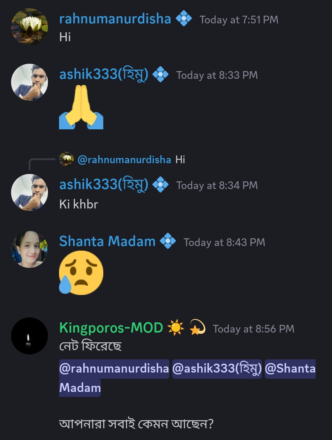 এসবের মাঝে যখন হঠাৎ করে শুভ দার মেসেজটা ঢুকলো তখন মনটা যারপরনাই খুশিতে ভরে গেলো। আসলে যে মানুষগুলোকে সারাক্ষণ দেখতে থাকি, যাদের সাথে সারাক্ষণ ভার্চুয়ালি কথাবার্তা চলতেই থাকে সেই মানুষগুলোর সাথে ৪-৫ দিন কথা না হওয়ার থাকার পরে যখন তারা ফিরে আসেন স্বাভাবিক ভাবে দারুন একটা ভালো লাগা কাজ করে। শুভদাকে রিপ্লাই করে সোজা আমাদের জেনারেল চ্যাট খুলে ফেললাম। সেখানেও দেখি দু-তিন জন বাংলাদেশী সদস্য মেসেজ করেছেন। এক শান্তির বার্তা পেলাম। সবাই ভালো আছেন এবং ধীরে ধীরে সবাই ফিরবেন এই আশাতে মনটা যেন নেচে উঠলো।