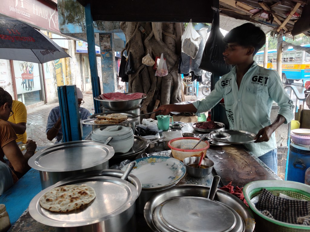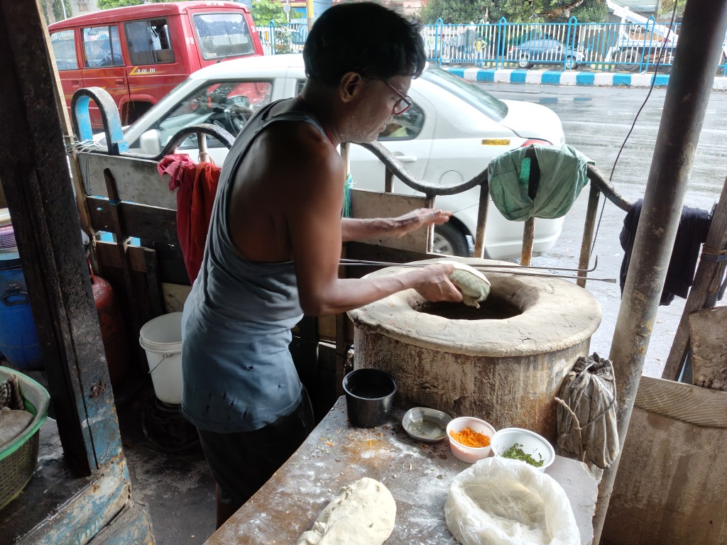 বৃষ্টির দিন দুপুরবেলা, কলকাতা শহরের কিছুটা কম ব্যস্ততার ফাঁকে বেরিয়ে পড়লাম দুপুরের খাবার সেরে নিতে। বৃষ্টি থামার কয়েক মিনিটে ফাঁকা মুহূর্ত পেয়েই বেরোনো। চারপাশ ভেজা, রাস্তাঘাটে অল্প নীচু জায়গায় জমে আছে জল, মাথার ওপরে গুঁড়ি গুঁড়ি বৃষ্টি তাই ছাতা নিয়ে বেরোলাম। বৃষ্টির কারণে খেতে বেরোতে একটু দেরী হয়েই গিয়েছিল তাই পছন্দের খাবারের দোকানটিতে সবকিছুই শেষ। আবহাওয়া বেশ সুন্দর তাই হাঁটতে হাঁটতে রাসবিহারী এভিনিউয়ের কাছে পৌঁছে গেলাম। মূলত সেখানে বেশ কয়েকটি খাবারের দোকান আছে। কি খাবো সেটা বিবেচনা করছি আবার ঝমঝমিয়ে শুরু হলো। ছাতা কাজে আসবে না, তাই হাতের সামনে থাকা ছোট্ট খাবারের দোকানটা আশ্রয় নিলাম। দাঁড়াতে মশলার ঘ্রাণ পেলাম! তাকিয়ে দেখি ধোঁয়া ওঠা গরম তন্দুরি রুটি, পাশে রাখা বিশাল সসপ্যানে নানান সবজি। যেই খাবারের দিকে তাকিয়েছি অমনি বরুণ দেব থামলেন।