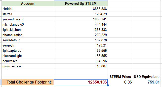 I will try to keep track of the impact of this challenge, a table with the accounts' "contributions", that's why I need you to let me know of your power up, as I do not track the blockchain transfers in general.