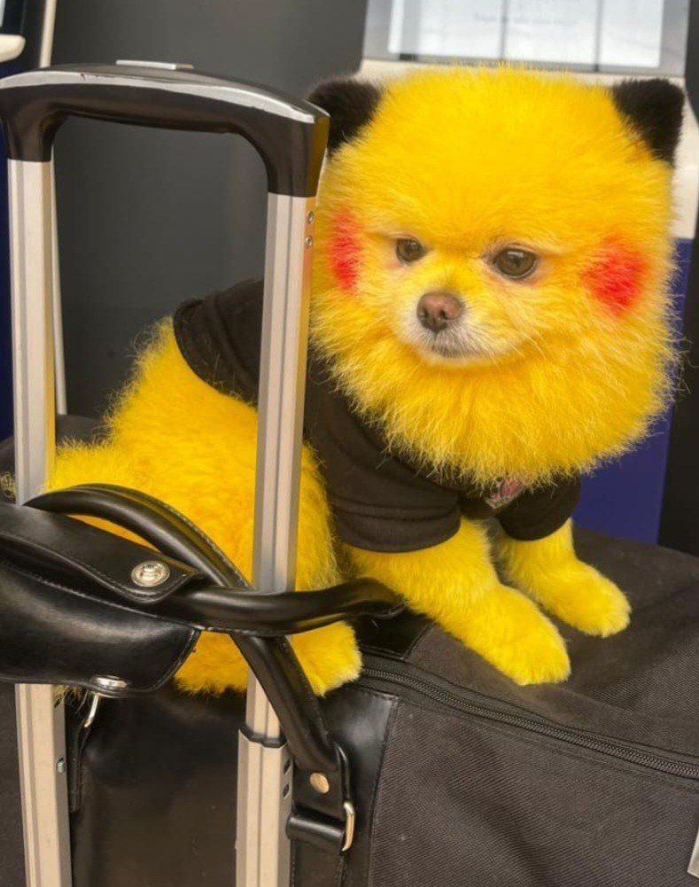 This dog is dyed yellow. I don't mean to be annoying, but I don't think it's right. I suppose the poor dog must feel something, or maybe they're using a dye suitable for dogs' PH. Honestly, I don't think the person dyeing the dog thought it through.