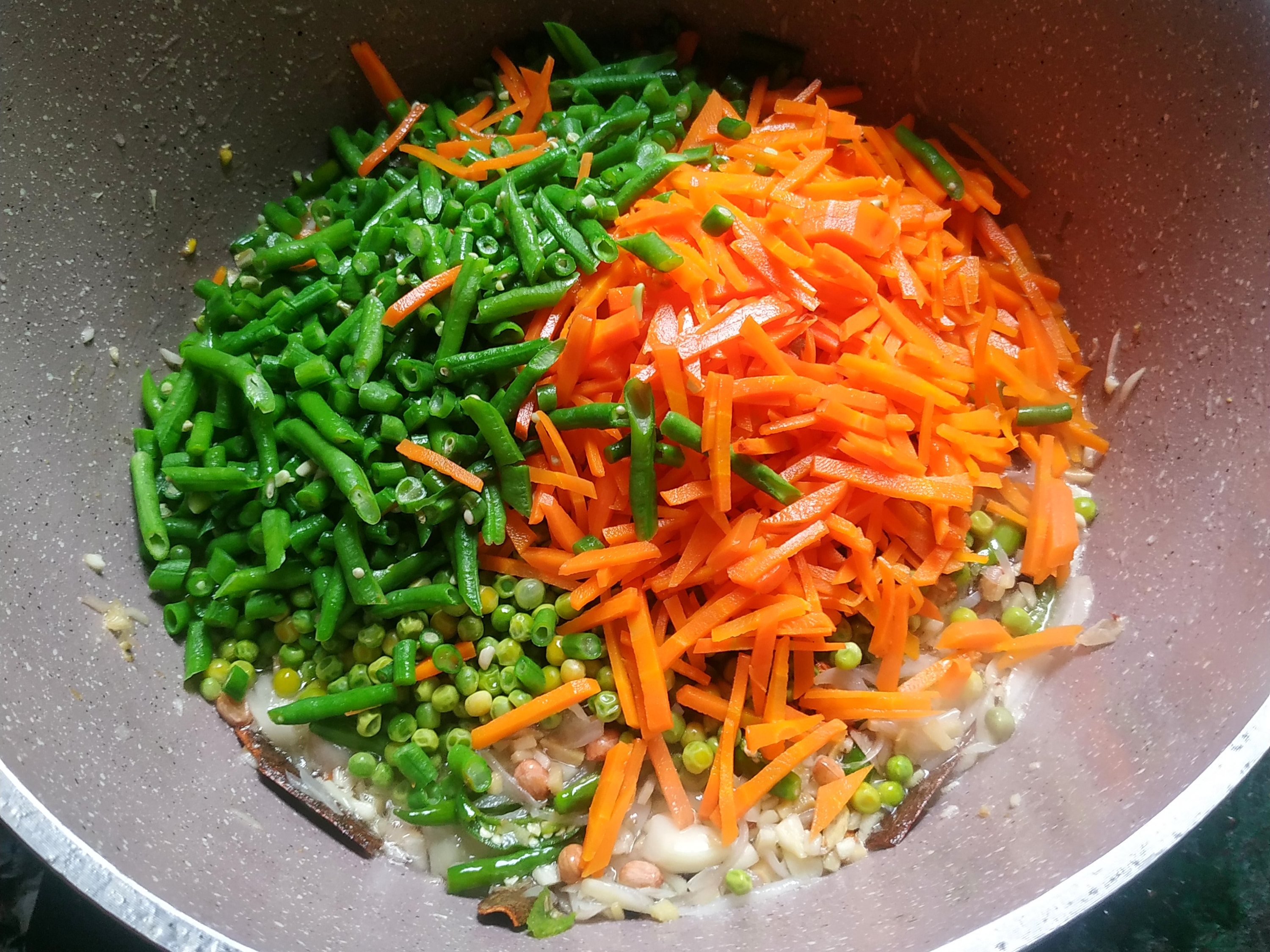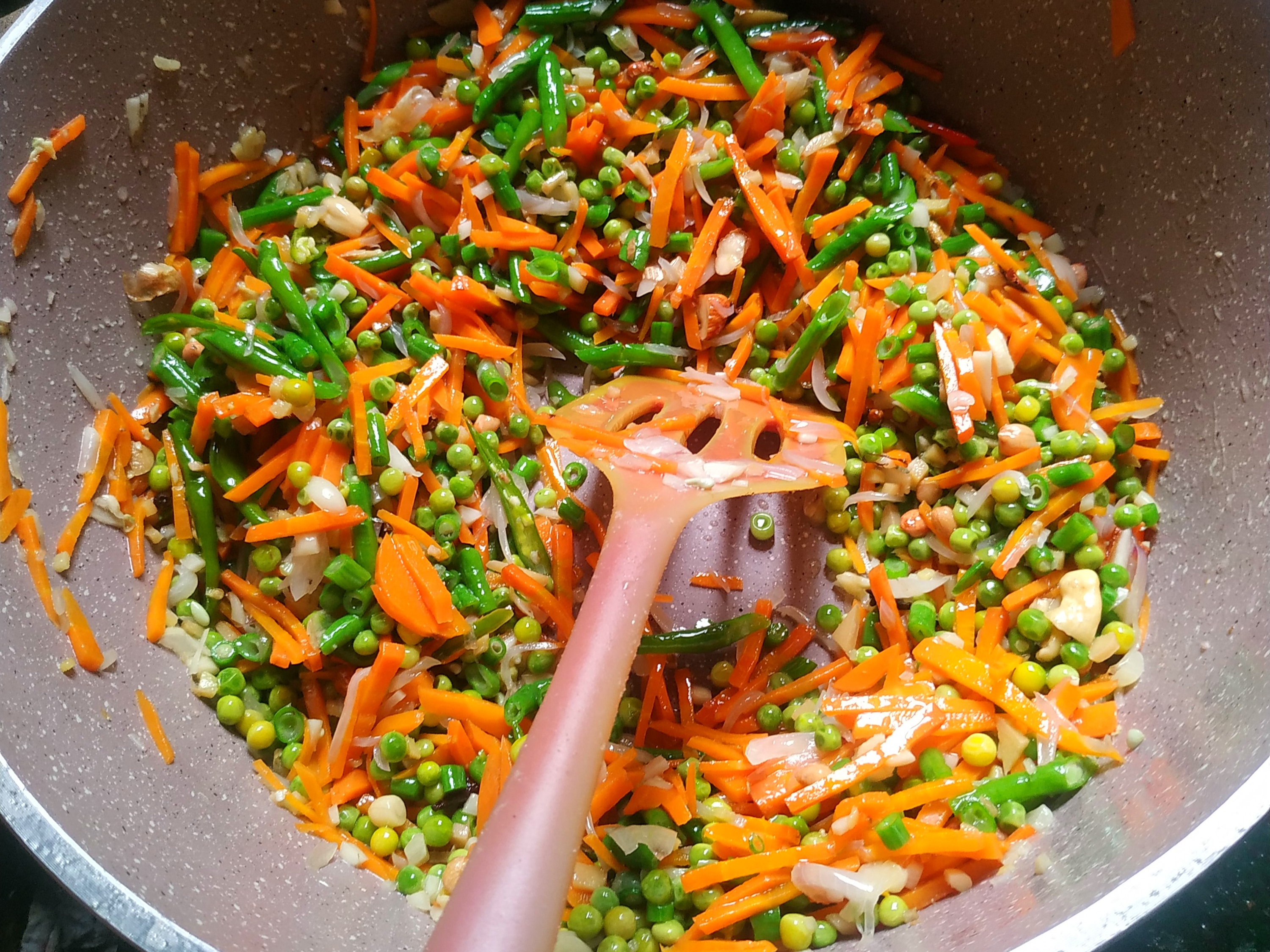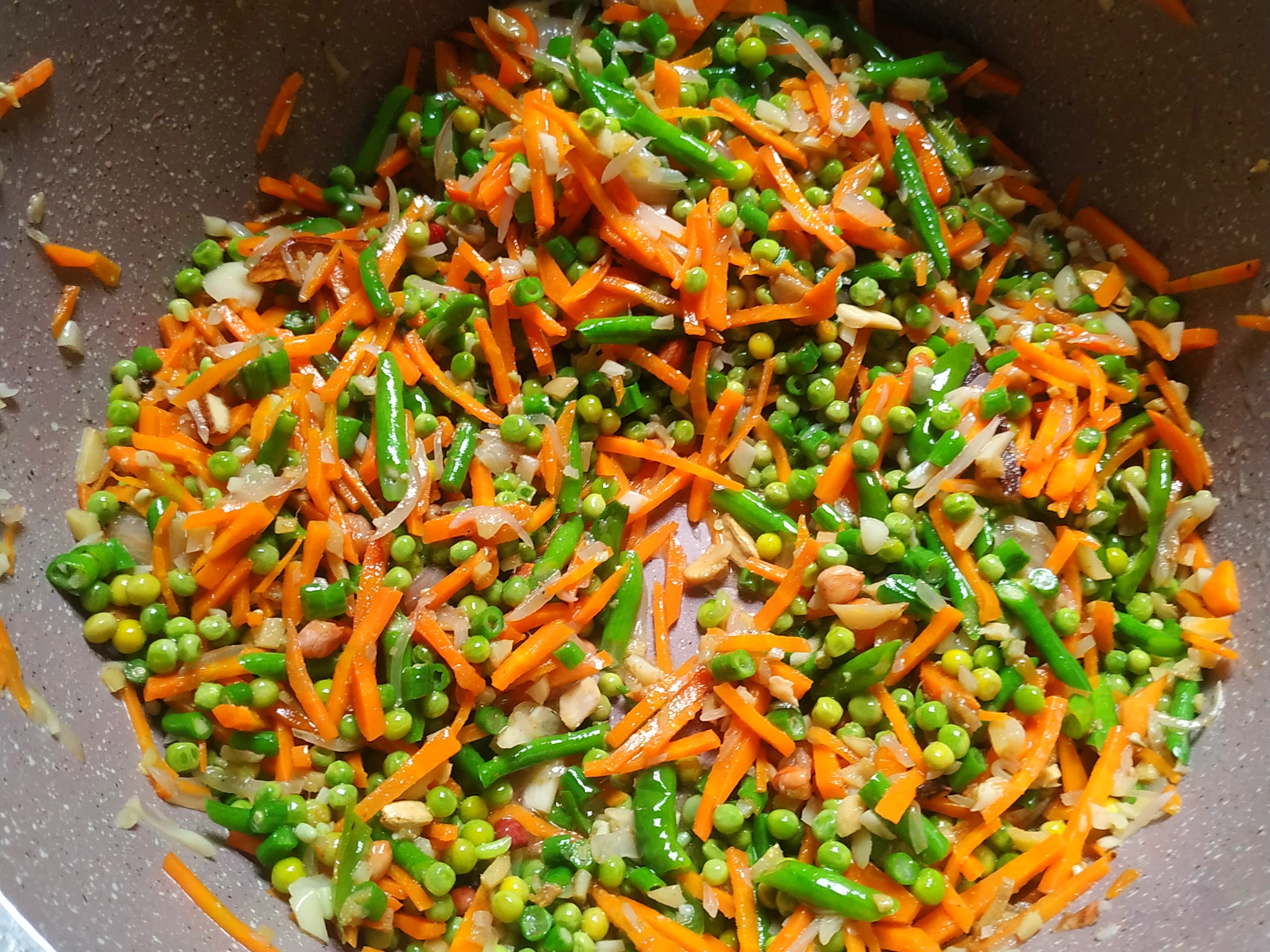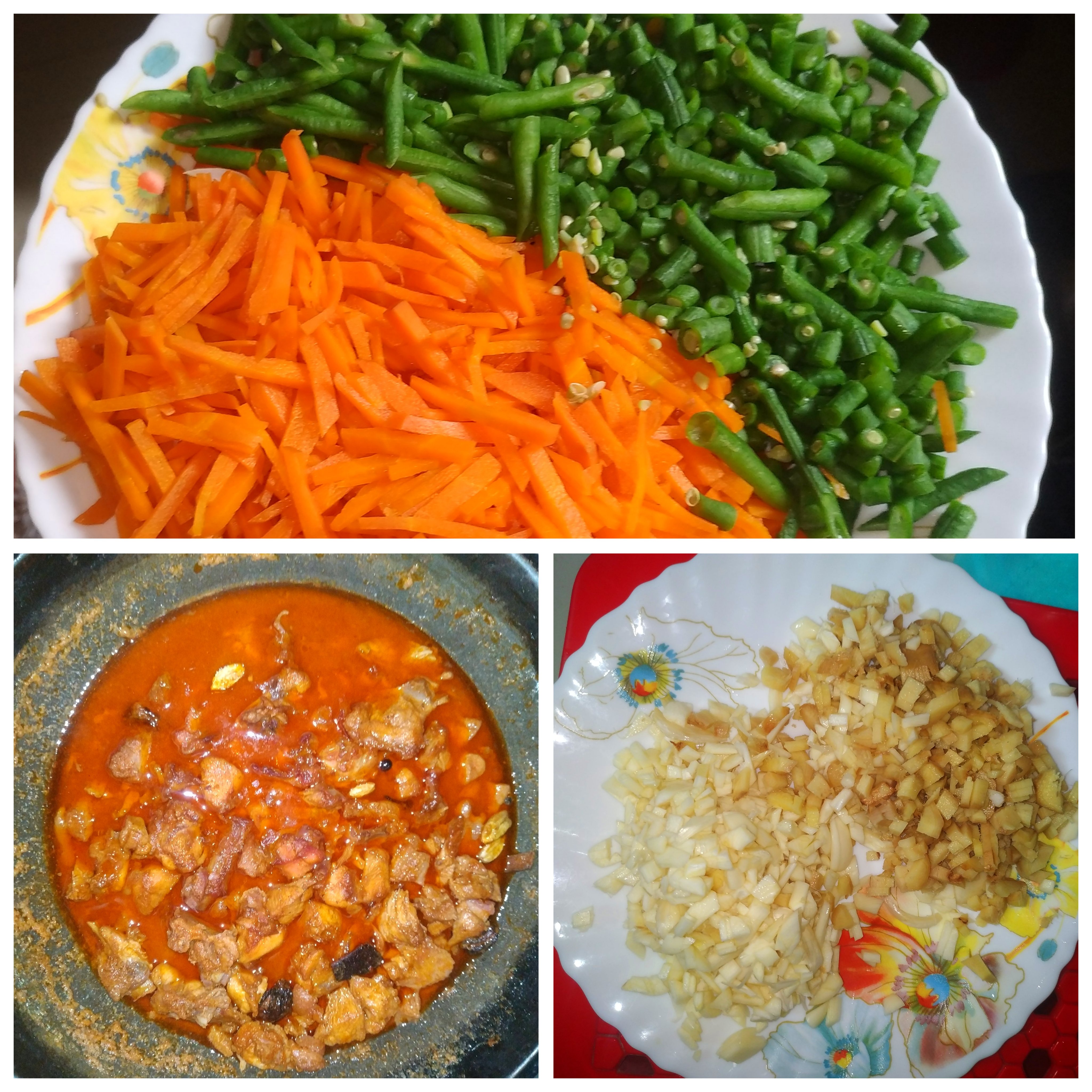 - তারপরে আমি পেঁয়াজ আদা,রসুন তেলে ভেজে নেওয়ার পরে, তার ভিতরে আমি বরবটির গাজর এবং অন্যান্য সবজি কুচি গুলো দিয়ে দিলাম।