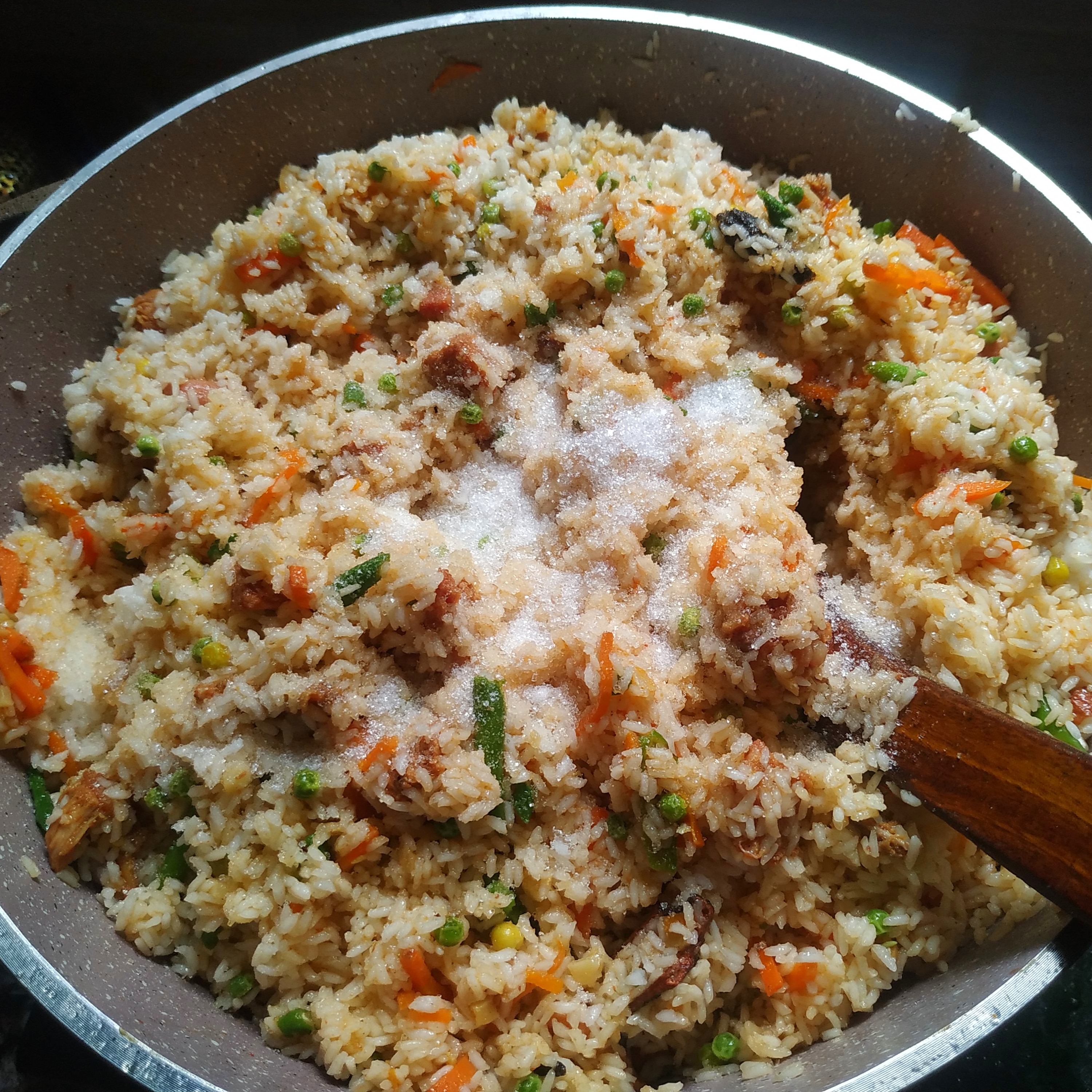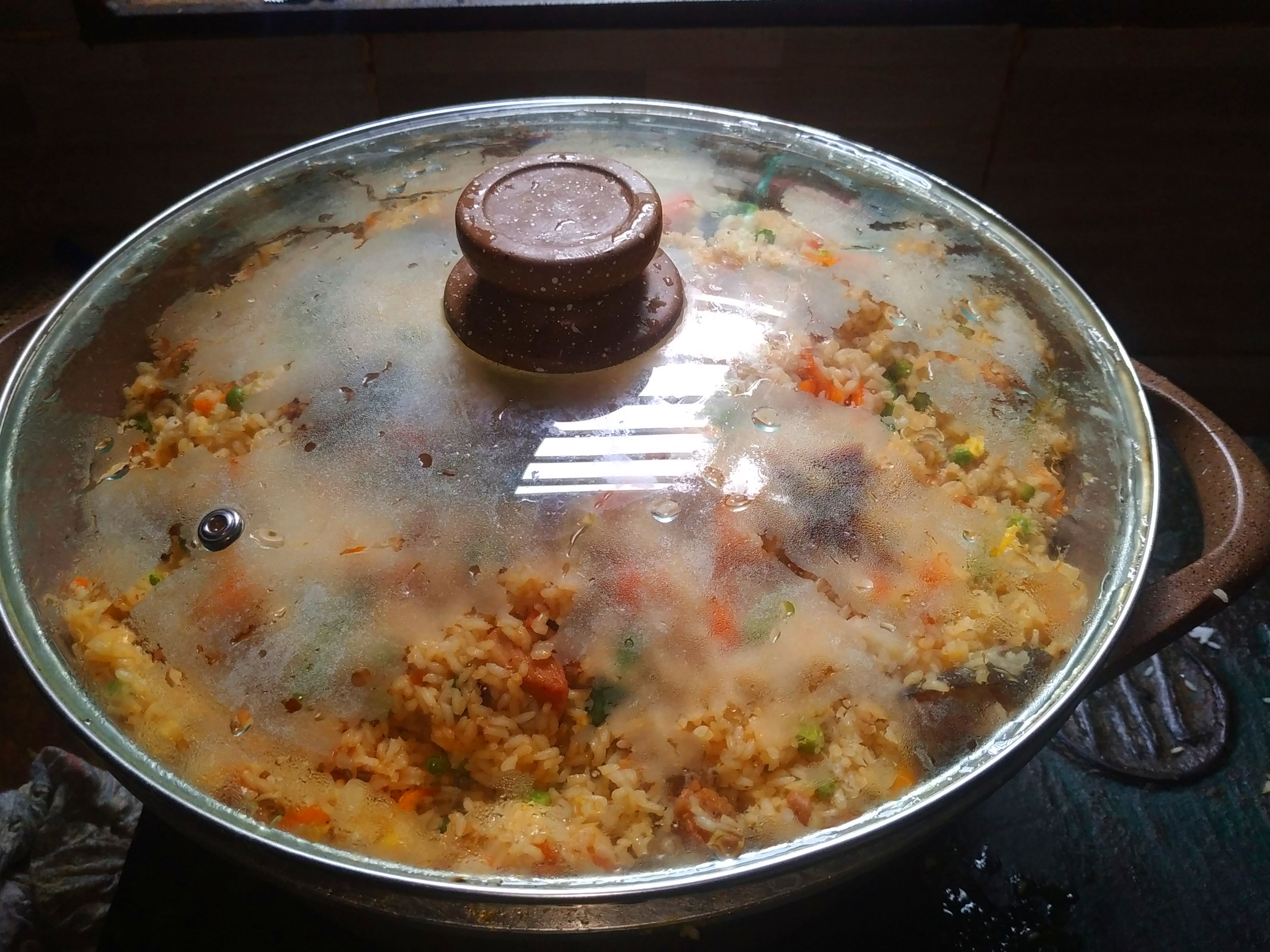 - তারপরে আমি রেসিপিটা ভালোভাবে তৈরি করার জন্য ঢাকনা দিয়ে ঢেকে কিছুক্ষণ রেখে দিলাম। এবং একটু পরে আমি এই ঢাকনাটি খুলে দেখতে পেলাম রেসিপিটা তৈরি হয়ে গেছে। এভাবে আমি ফ্রাইভ রাইচ রেসিপি শেষের ধাপে এসে পৌঁছালাম।