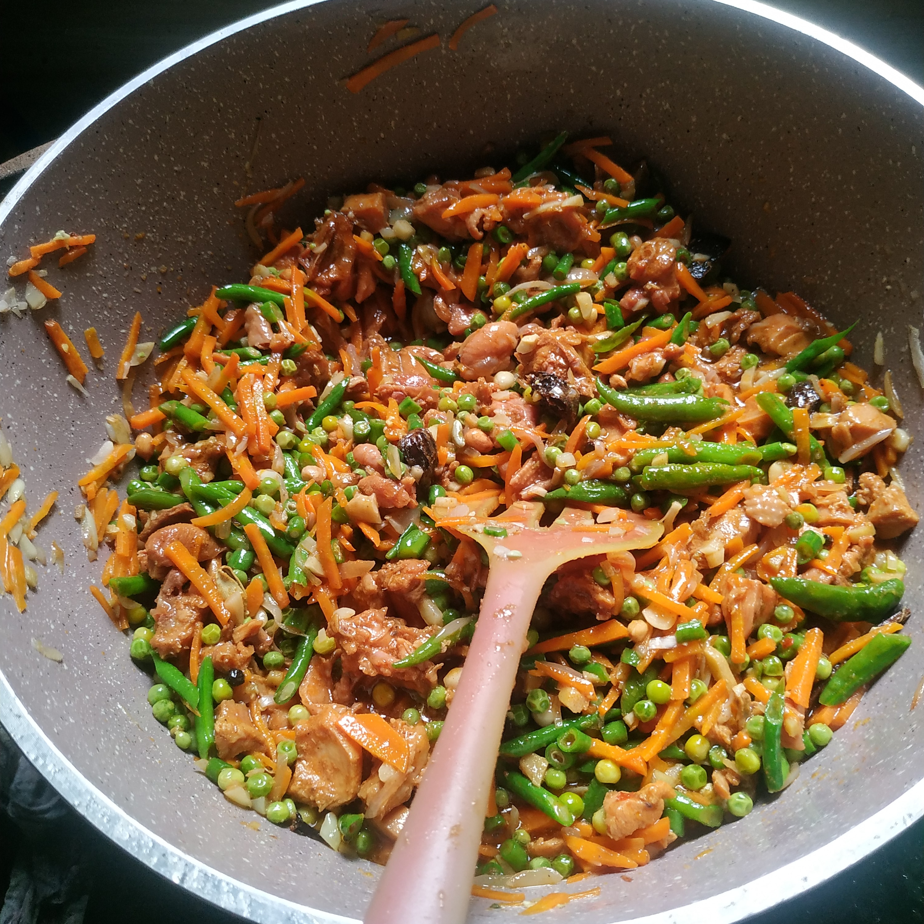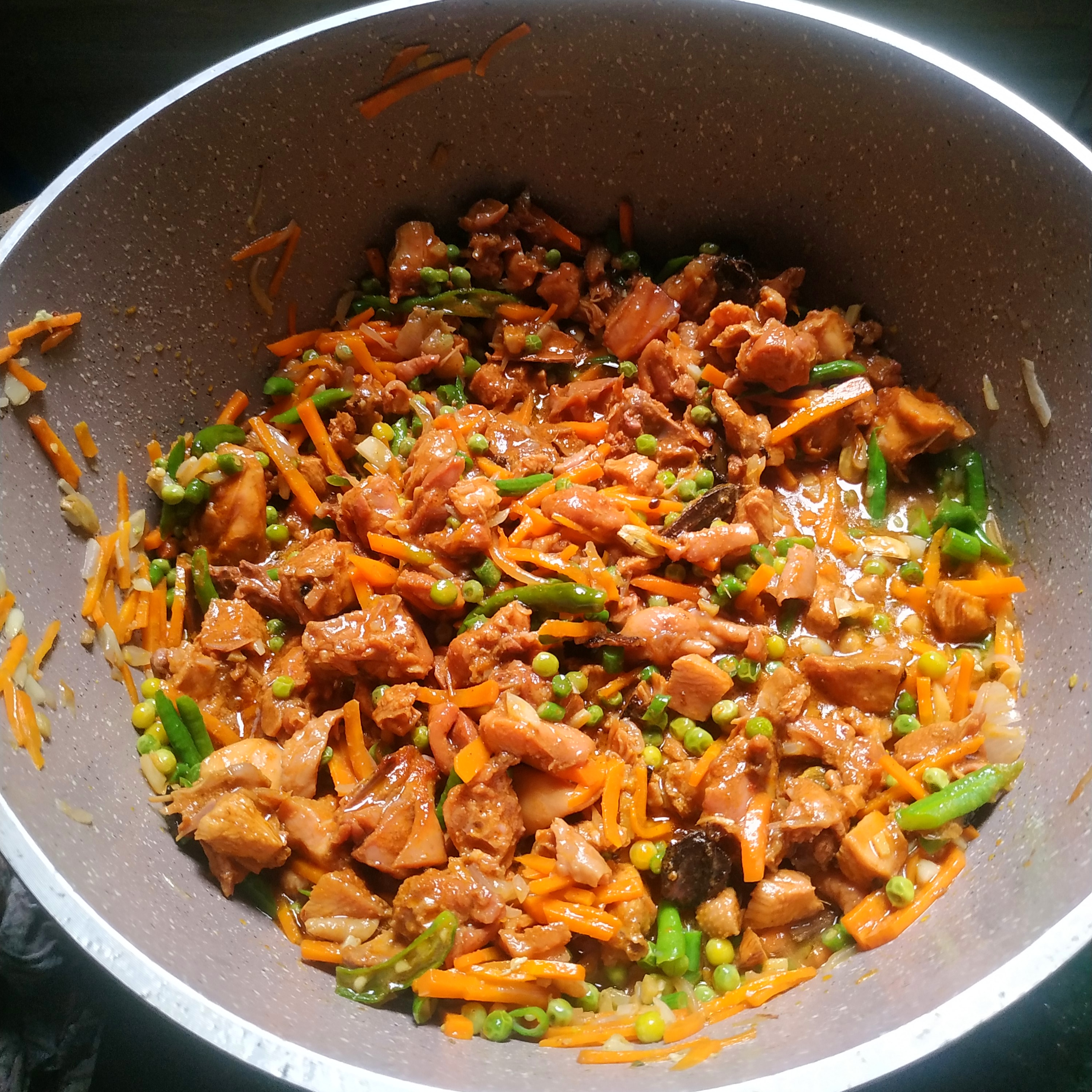 - সবজিও মুরগির দিয়ে জ্বাল দেওয়ার পরে তার ভিতরে আমি ভাত গুলো দিয়ে দিলাম। এই ভাত আমি আগেই ঝরঝরা করে তৈরি করেছিলাম।