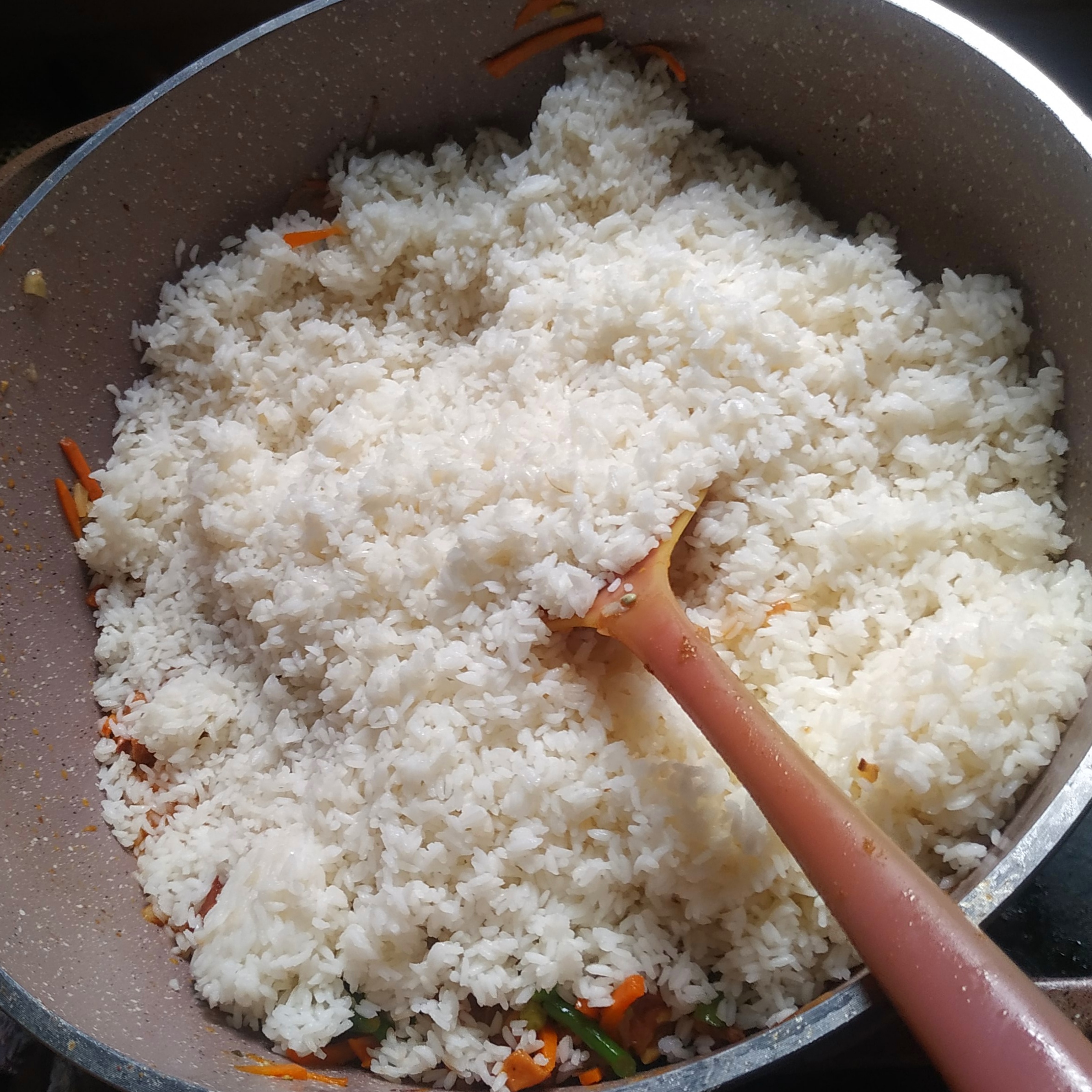 - তারপরে এই ভাতগুলো আমি সবজির সাথে ভালো করে মাখিয়ে জ্বাল দিতে লাগলাম।ফ্রাইভ রাইচ রেসিপি তৈরি করার জন্য।