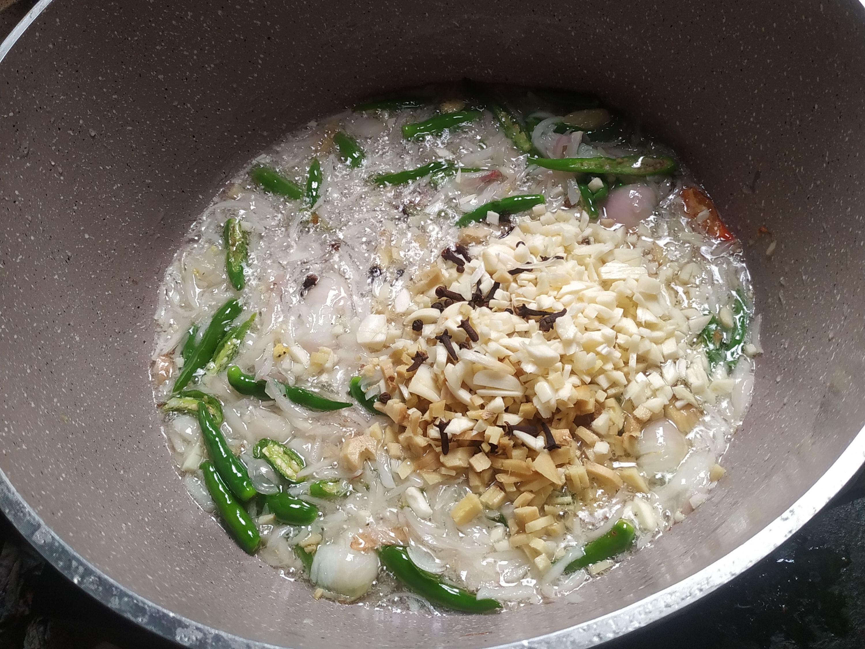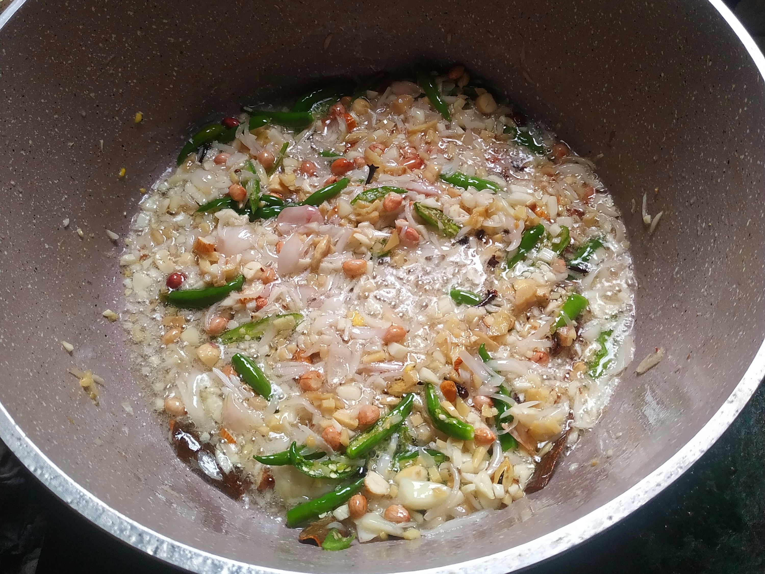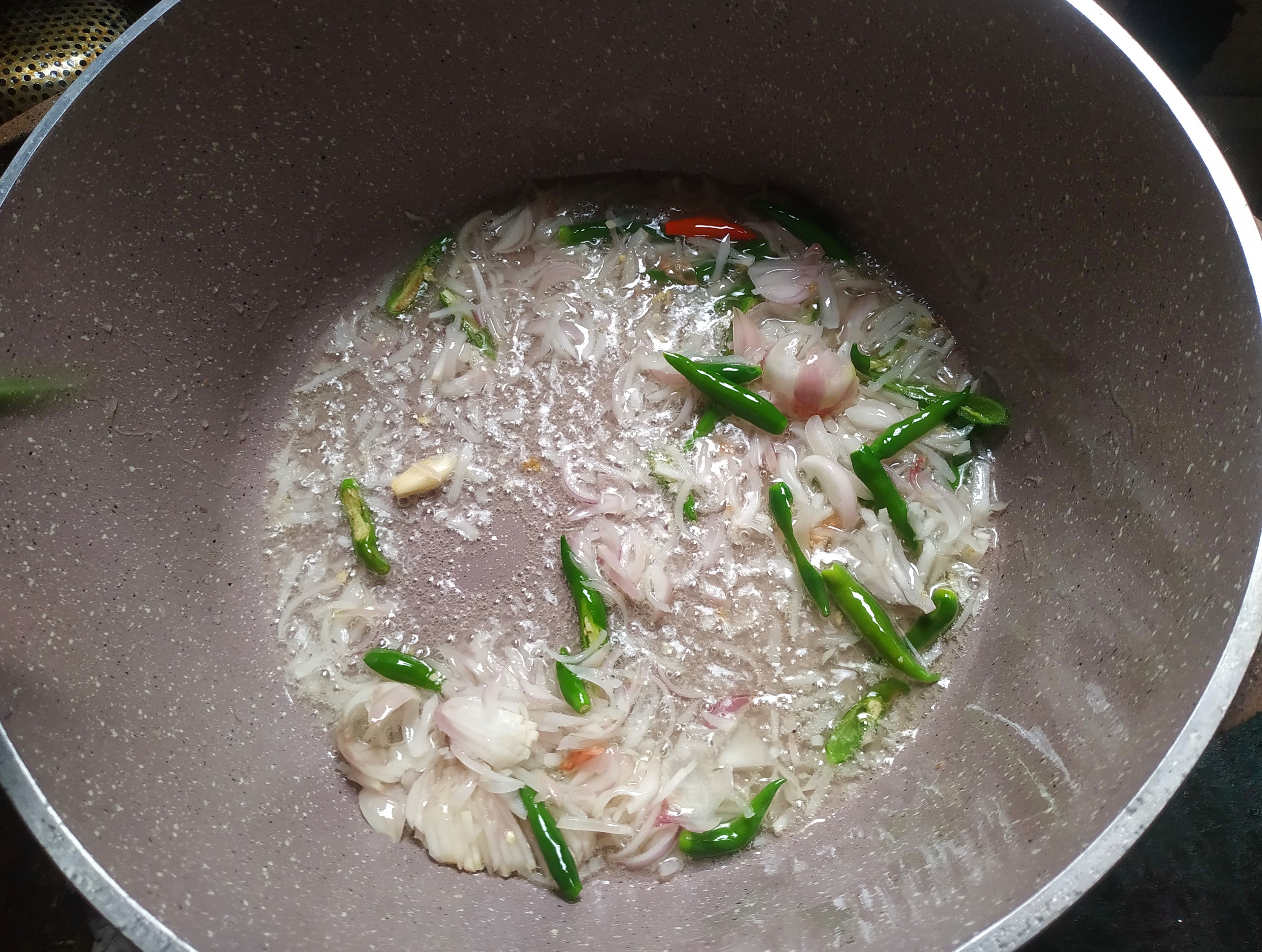 - মজাদার এই রেসিপি তৈরি করার জন্য, প্রথমে আমি কড়াই এর মধ্যে পেঁয়াজকুচি রসুন কাঁচা মরিচ এবং আদা নিয়ে তেলে ভালো করে ভেজে নিলাম।