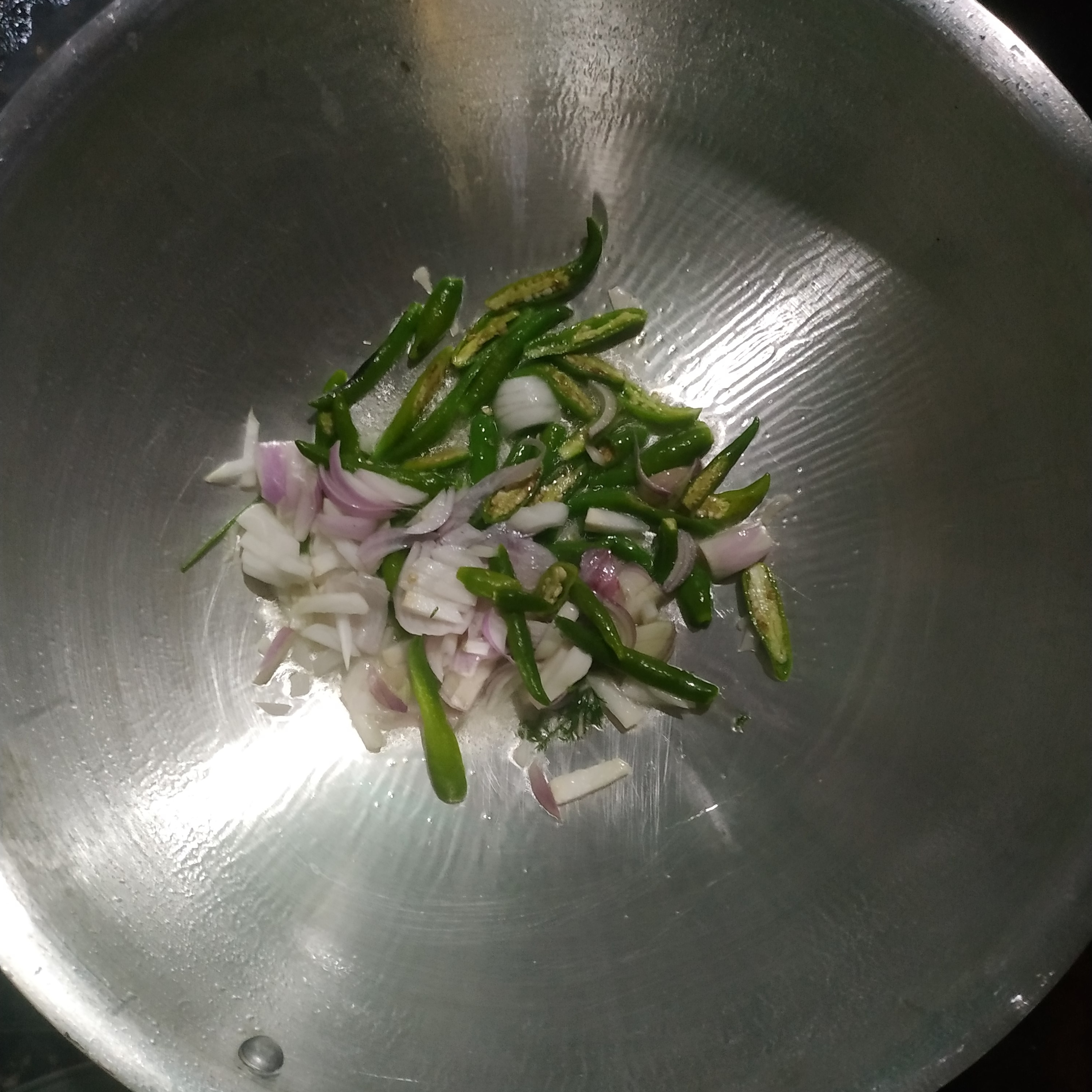- সুস্বাদু এই রুই মাছের রেসিপি তৈরি করার জন্য, প্রথমে আমি কড়াইয়ের মধ্যে পেঁয়াজ কাঁচামরিচ অন্য অন্য মসলা জ্বাল দিতে লাগলাম।