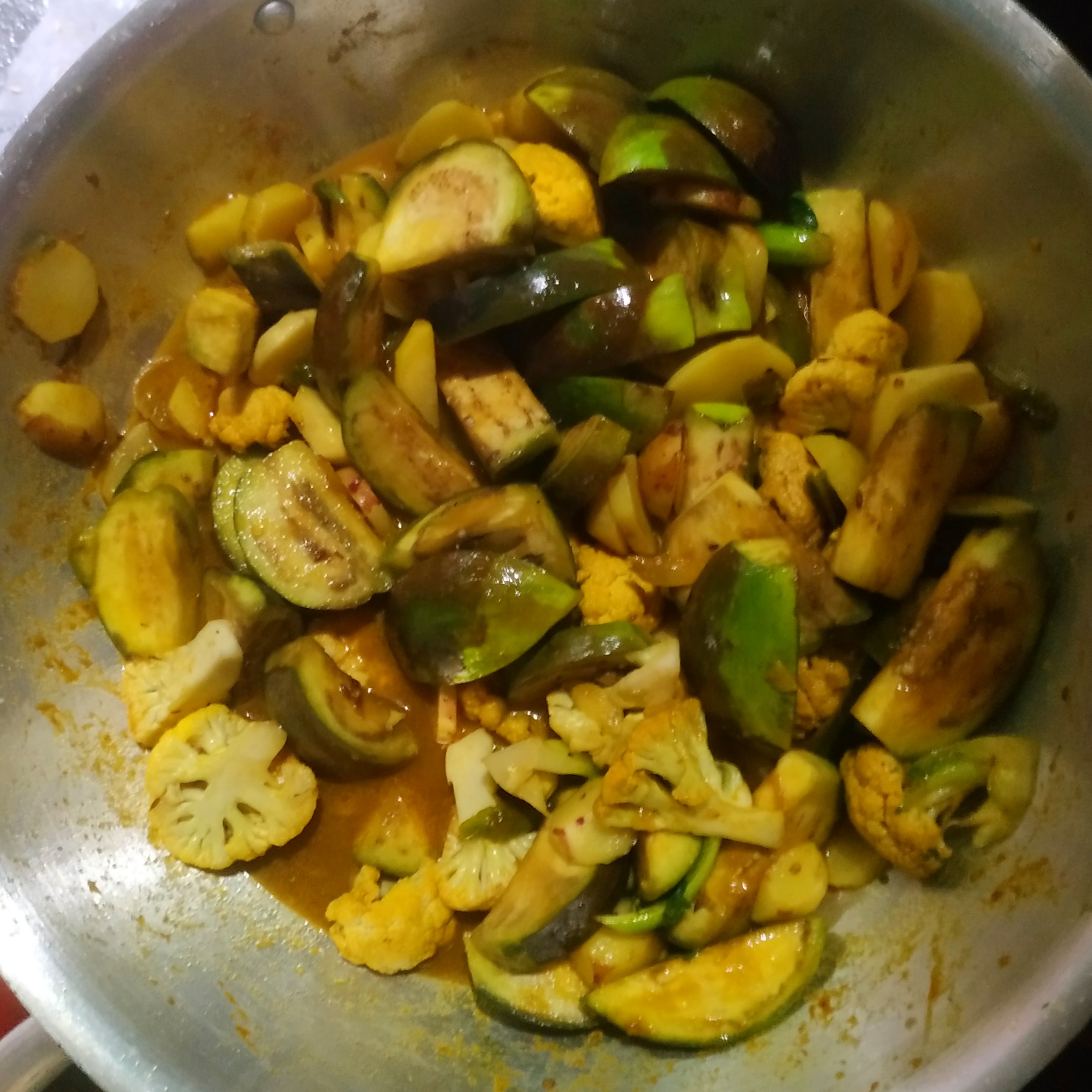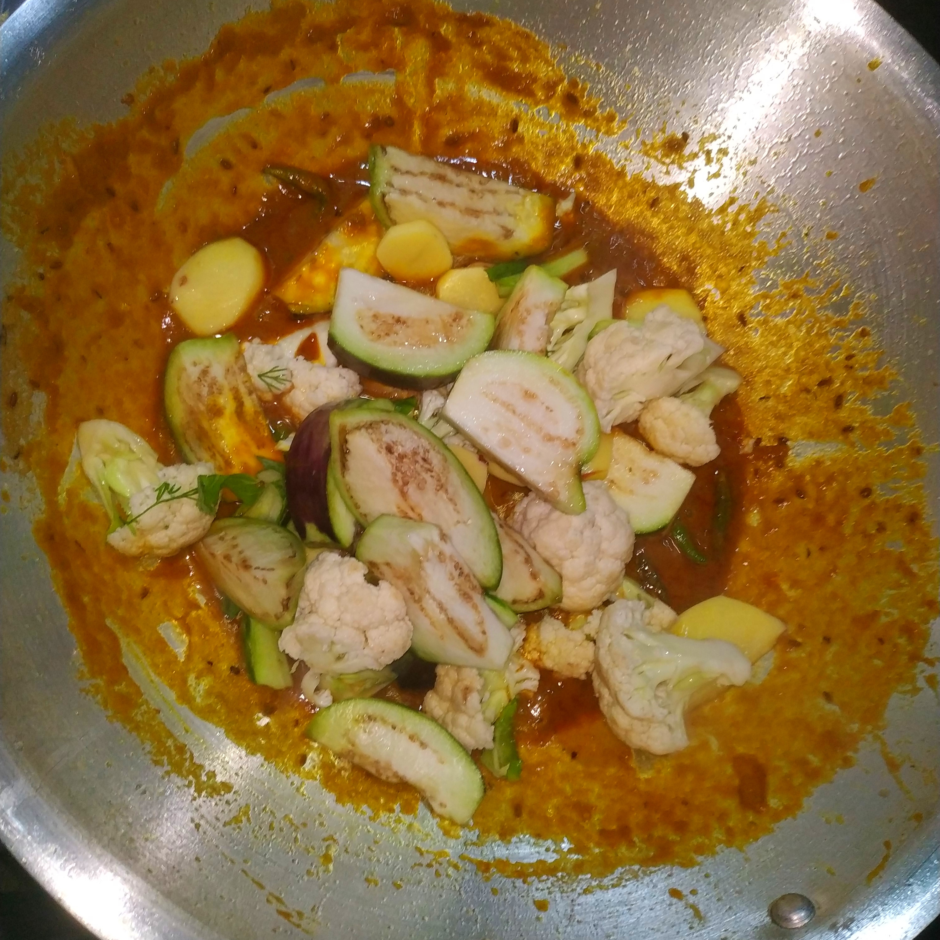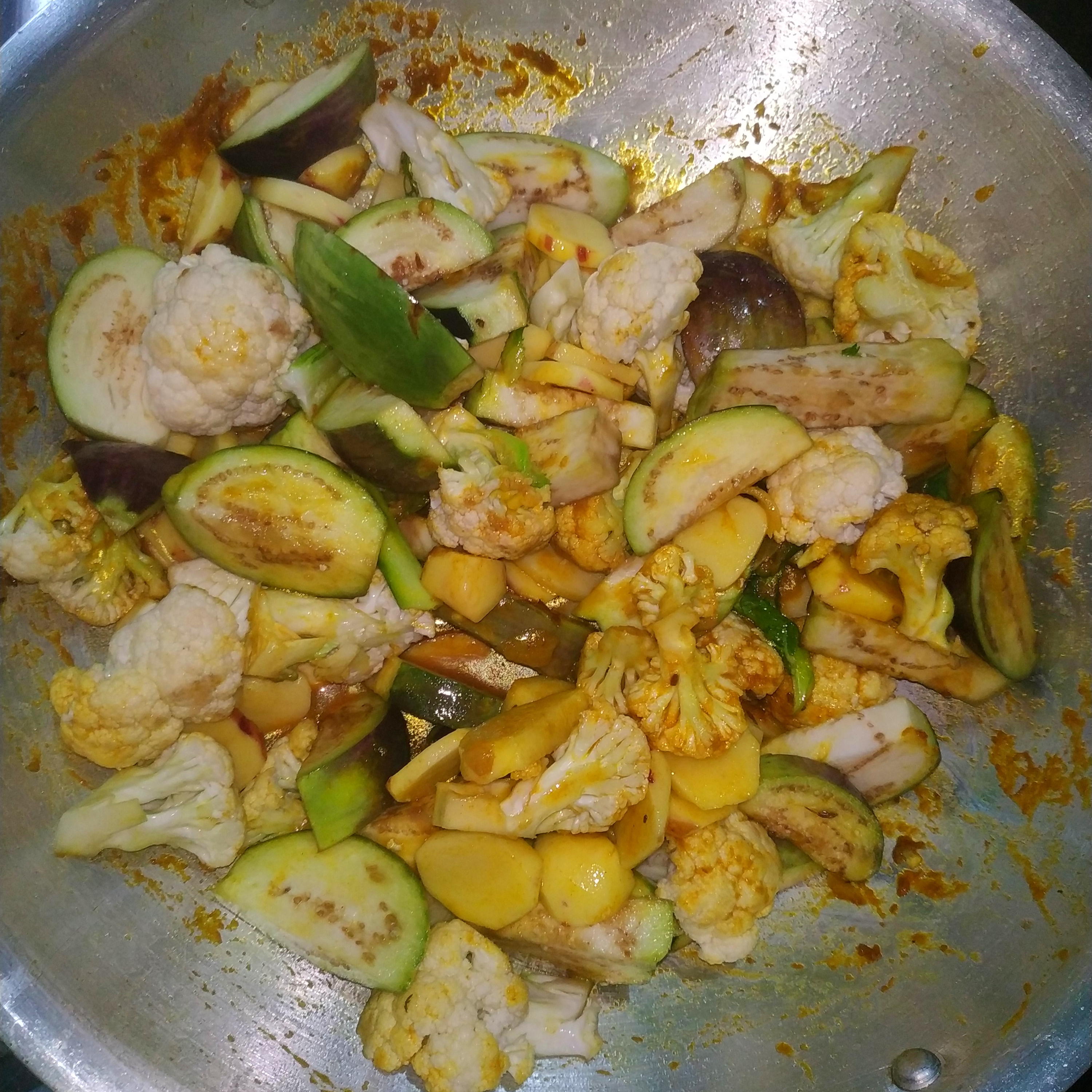 - তারপর মসলা ঝোলের মধ্যে আমি ফুলকপি, আলু ও বেগুনের সবজি দিয়ে মাখাতে লাগলাম।