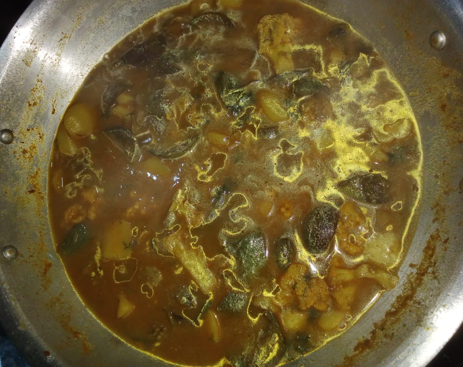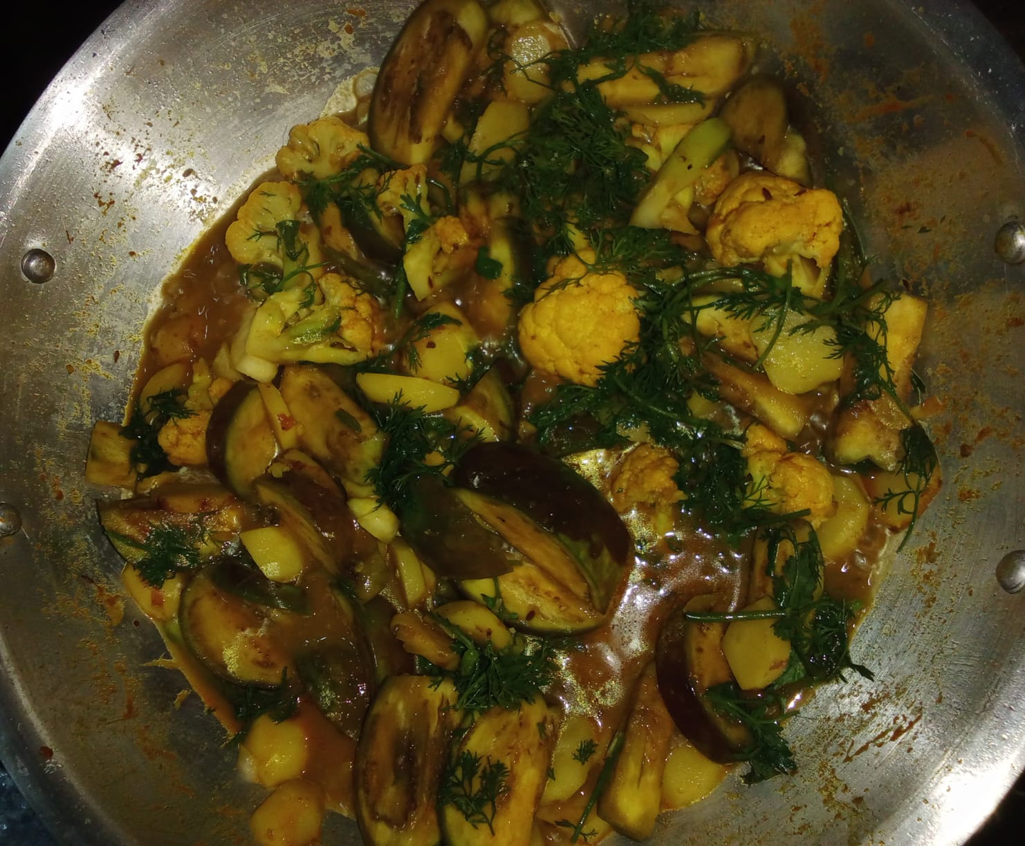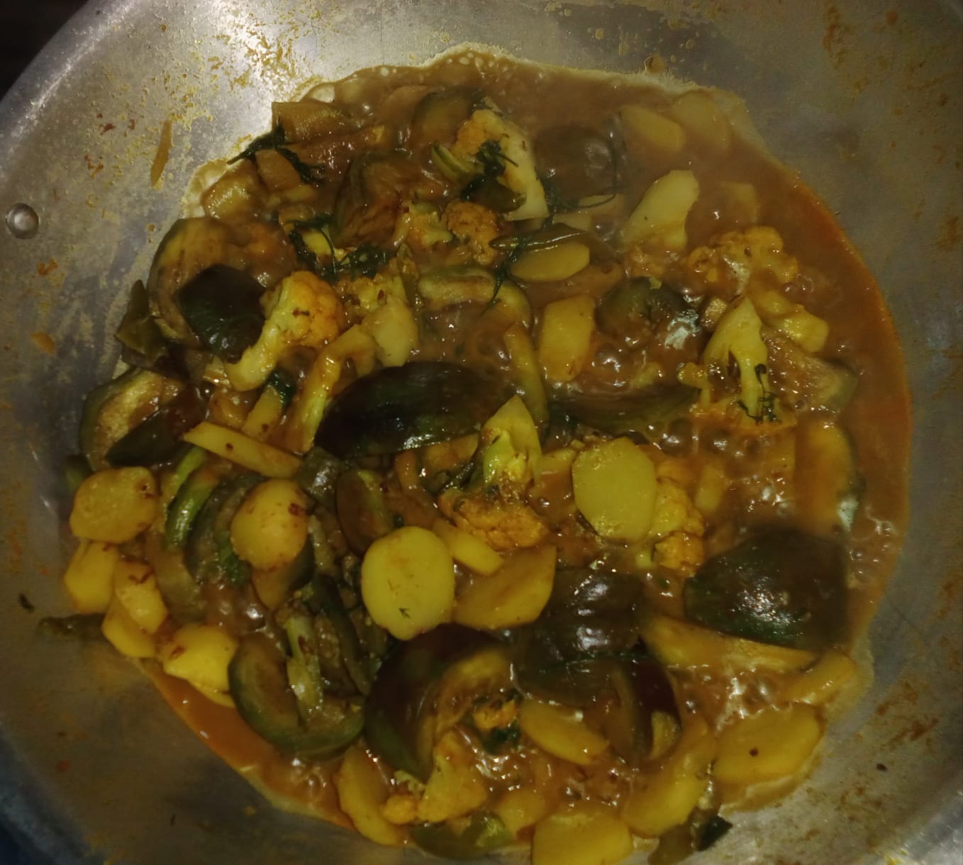 - তারপর মসলা ঝোলের মধ্যে আমি ফুলকপি, আলু ও বেগুনের সবজি দিয়ে মাখাতে লাগলাম।