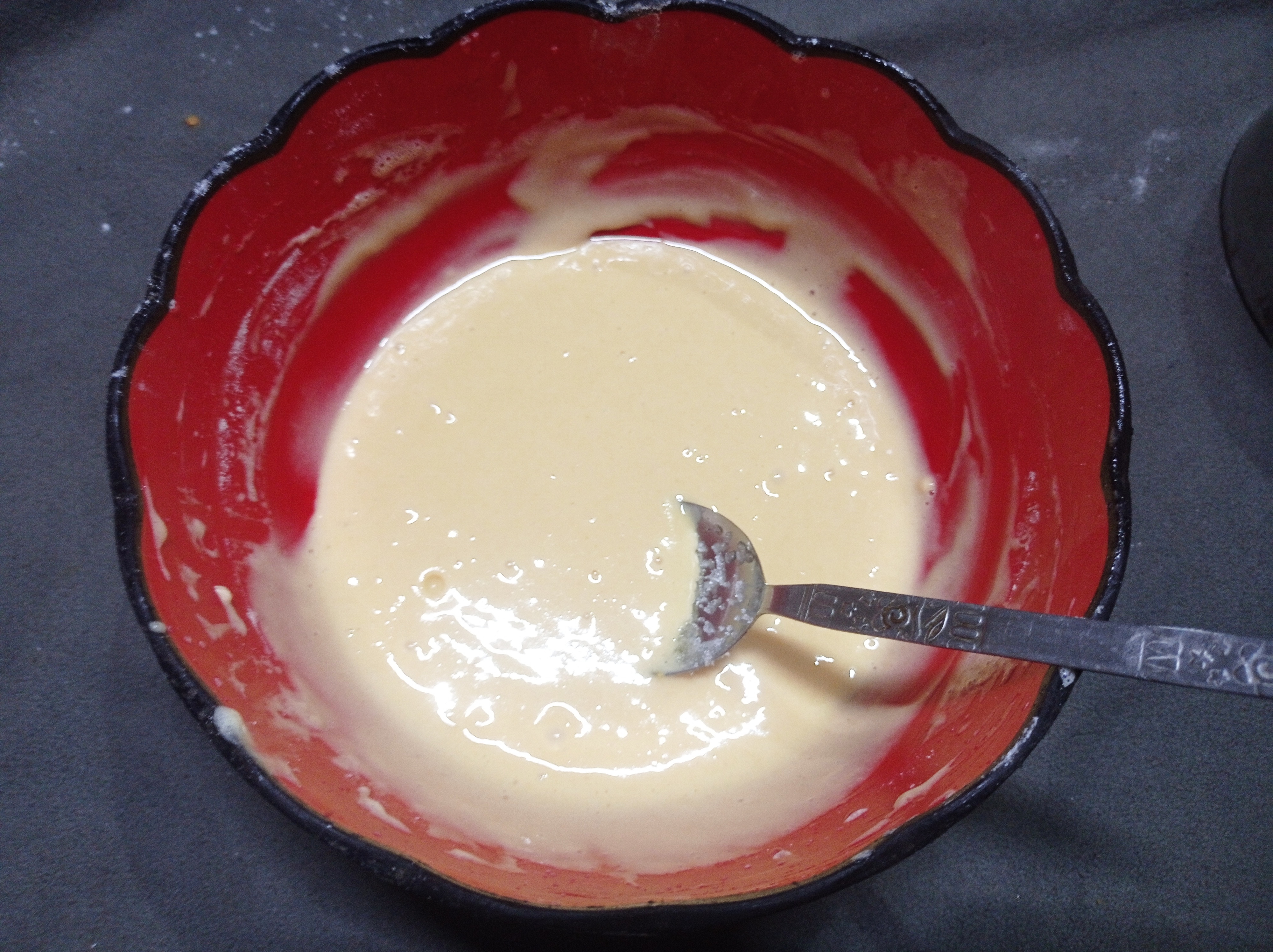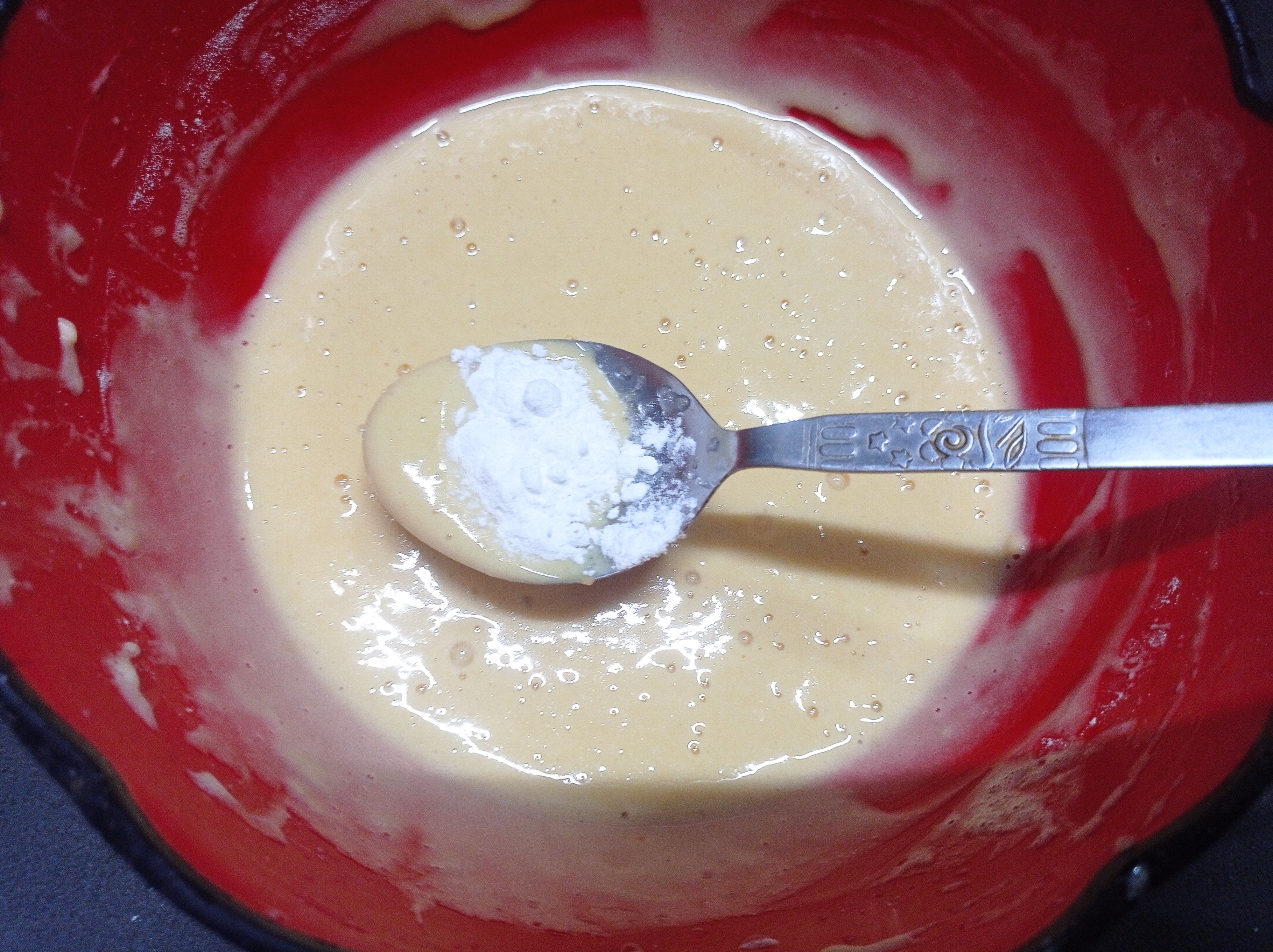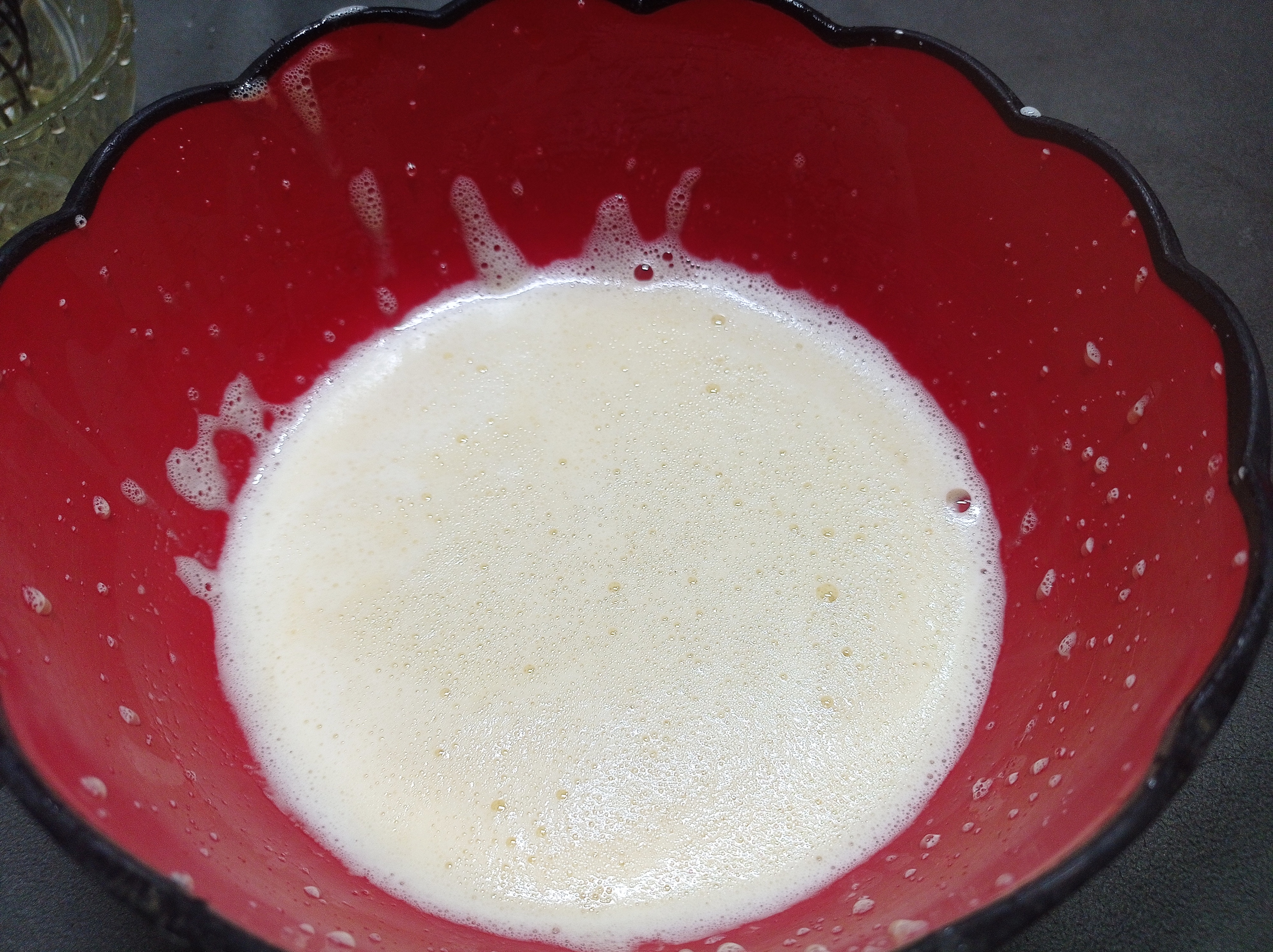 • প্রথমে ডিম দুটি ভেংগে কুসুম আলাদা করে নিয়ে ফেটে নিব ভালো করে। তারপর কুসুম এবং পরিমাণমতো চিনি দিয়ে ভালভাবে মিশিয়ে নিব যেন দানা না থাকে।