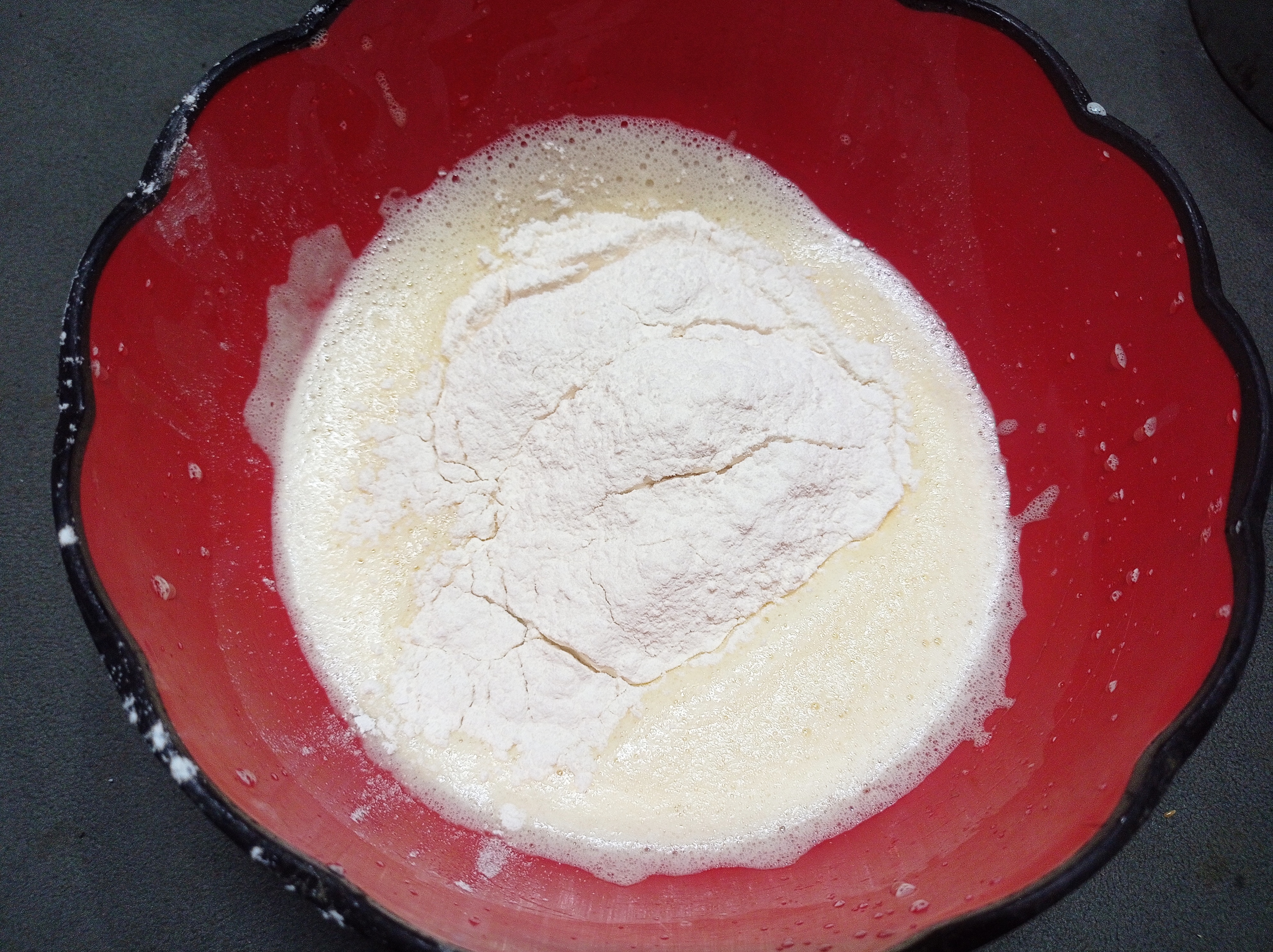 • এবার ময়দা ডিম এবং চিনির মিশ্রণ এর ভিতর ঢেলে নিব।ভালো করে মিশিয়ে নিব সব কিছু।