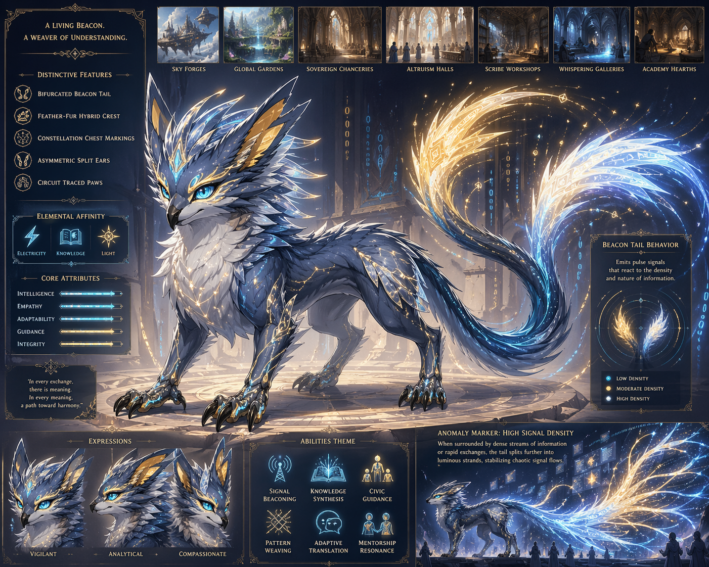 Aetherix Luminara, often referred to as “The Civic Beacon” or “Signalwarden,” is thought to have come into existence not through natural evolution, but from the convergence of knowledge, light, and collective intention. Ancient accounts from the Sky-Forges describe a critical moment when immense flows of scholarly, civic, and emotional information began to destabilize reality.