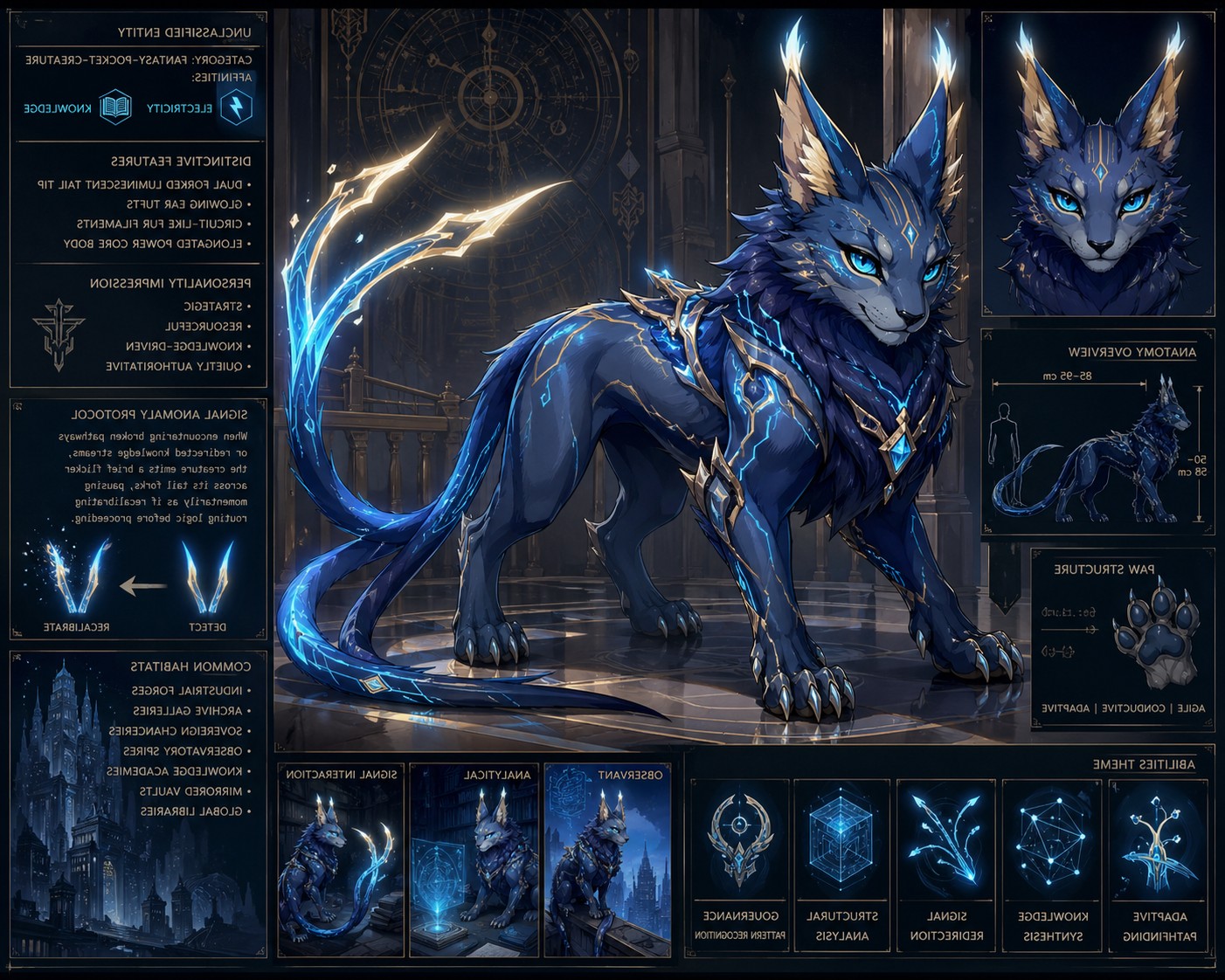 It is known as Aethervolt Lynaris, more commonly called Lynaris or the Signal Lynx. Long before civilizations began formally recording knowledge, there were immense living networks of information—ancient systems believed to exist even before written language. These were not physical libraries but dynamic webs of thought, memory, and logic woven into reality itself. From these networks, the first Lynaris came into being.