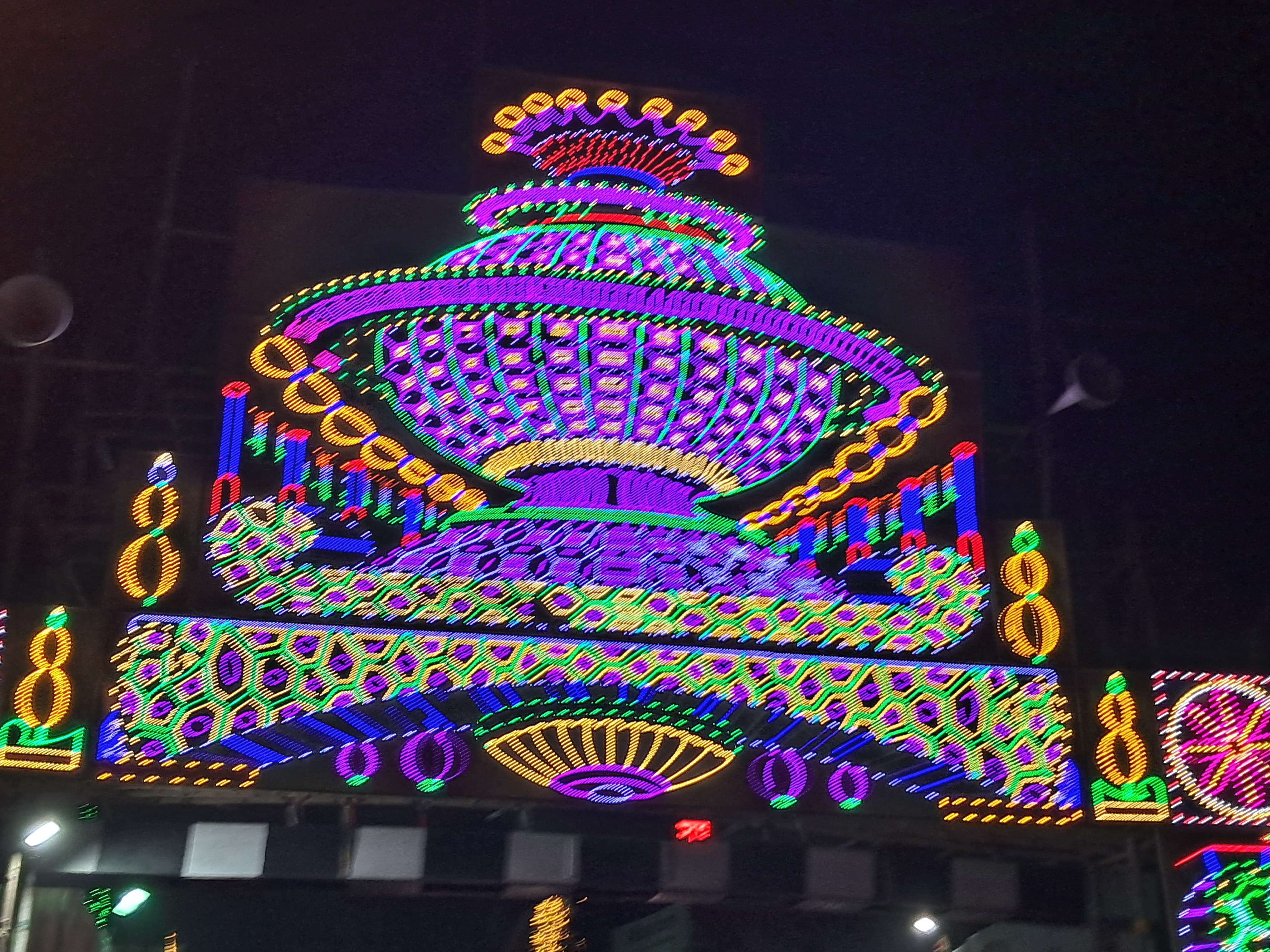 এই প্যান্ডেলের যে কাঠামোগুলো তুলে ধরা, তাতে যে গম্বুজাকৃতি মিনারের স্থাপত্যগুলো তৈরি করা, তাতে যে বিভিন্ন কালারের আলোকসজ্জ্বা দিয়েছে, তা দারুণভাবে এই প্যান্ডেলের বিষয়গুলোর সাথে ফুটে উঠেছে। এই প্যান্ডেলে লক্ষ্য করলে দেখতে পাবেন যে, এখানে মূলত ৫ টার মতো মূল মিনারের কারুকার্য করা আছে, এর মধ্যে একটি মিনারের উচ্চতা অনেক বেশি, মূলত বড়ো, ছোট, মাঝারি সবকিছু মিলিয়েই মিনারের বিষয়গুলো ভালো লাগছে। এই মিনারের আকর্ষনীয়তার মূল কারণ হলো লাইটিং এর ব্যাপার। এখানে লাল, বেগুনি এবং অন্যান্য বিভিন্ন কালারের মিক্সিংয়ে চারিদিক সৌন্দর্যে ভরে উঠেছে। আর এই প্যান্ডেলটি সম্পূর্ণভাবে আলোকিত করে তুলেছিল।
