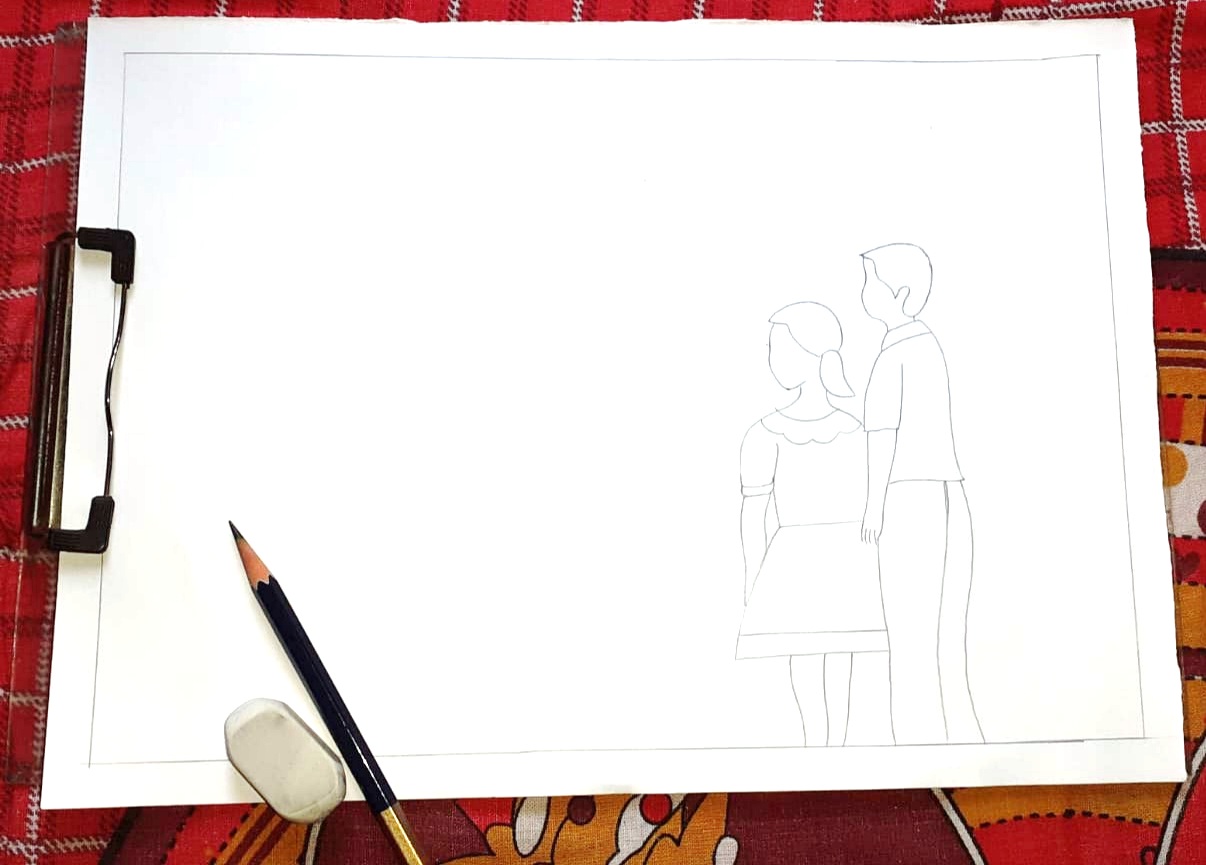 ❖প্রথম ধাপে একজন মহিলা আর একজন লোকের চিত্র সম্পূর্ণভাবে অঙ্কন করে নিয়েছিলাম অর্থাৎ তারা দুইজন একসাথে দাঁড়িয়ে আছে এমনটা দৃশ্য।