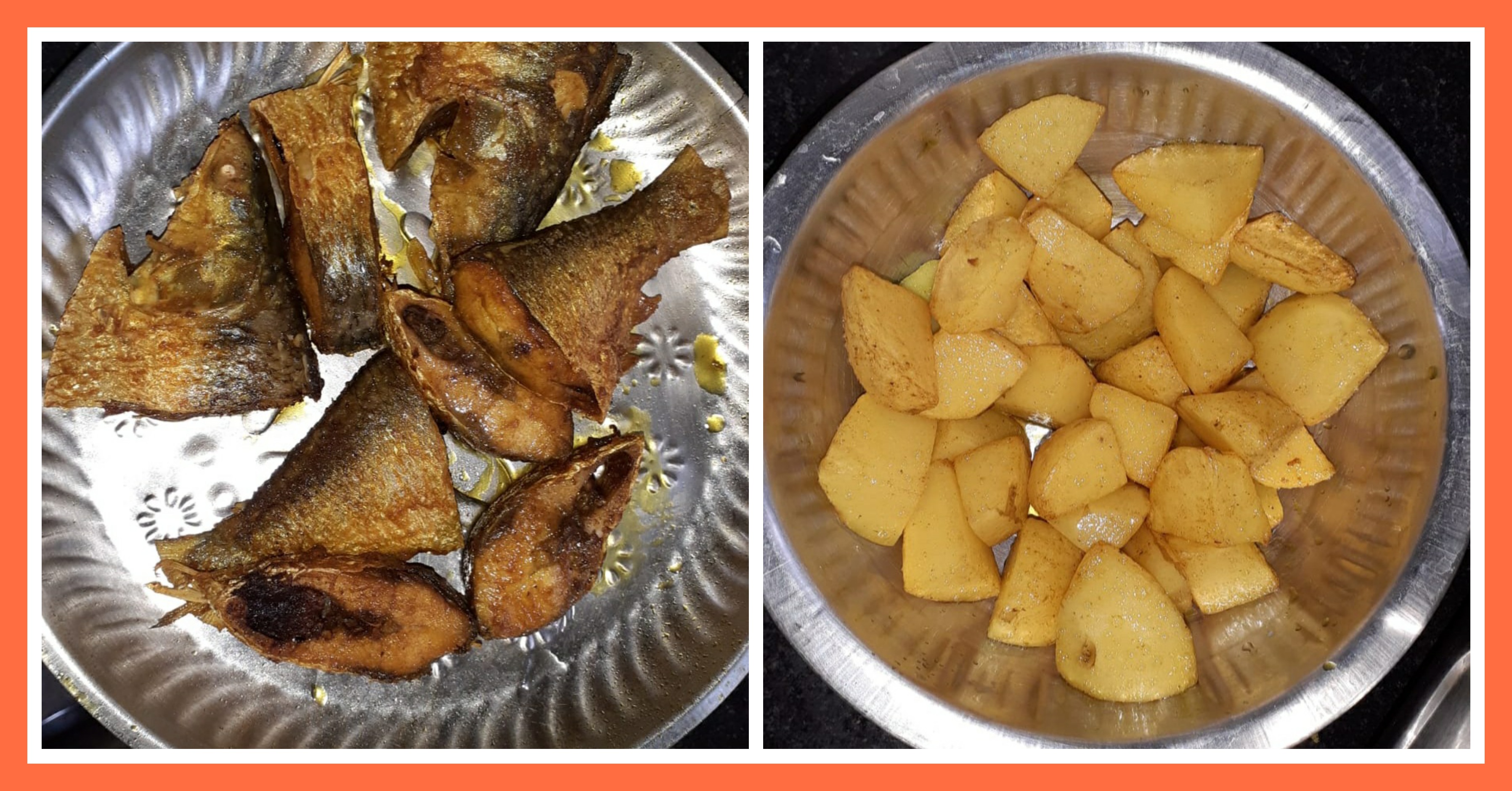 ➤মাছের সব পিচ ভালো করে ভেজে তুলে নিয়েছিলাম। এরপর আলুর পিচগুলোও জল দিয়ে ধুয়ে নিয়ে ভালো করে কড়াইতে করে ভেজে তুলে নিয়েছিলাম।