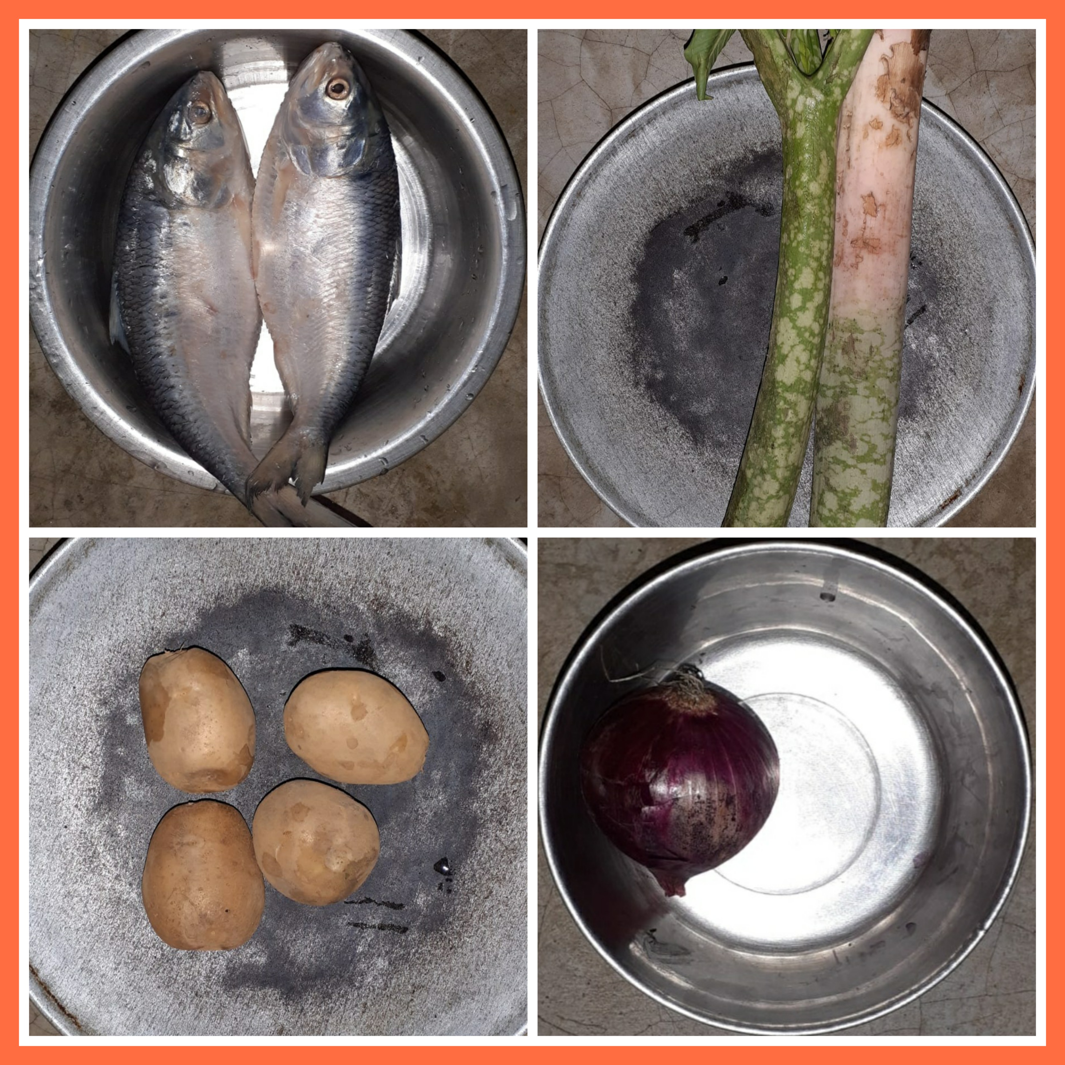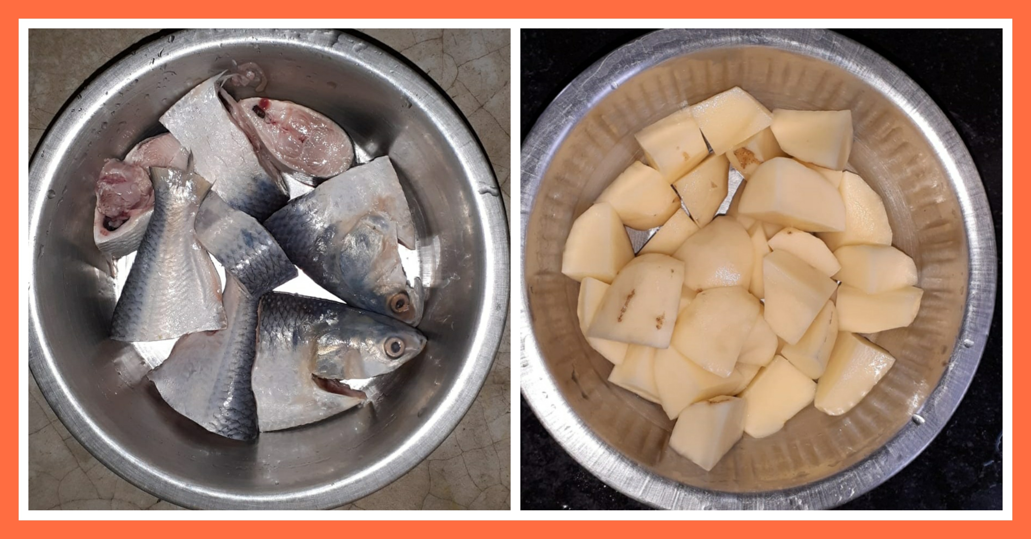 ➤ছোট ছোট ইলিশ দুটোকে কেটে সাইজ করে নেওয়ার পরে জল দিয়ে ধুয়ে ভালোভাবে পরিষ্কার করে নিয়েছিলাম। এরপর আলুগুলোর খোসা ছালিয়ে নেওয়ার পরে কেটে নিয়েছিলাম ।