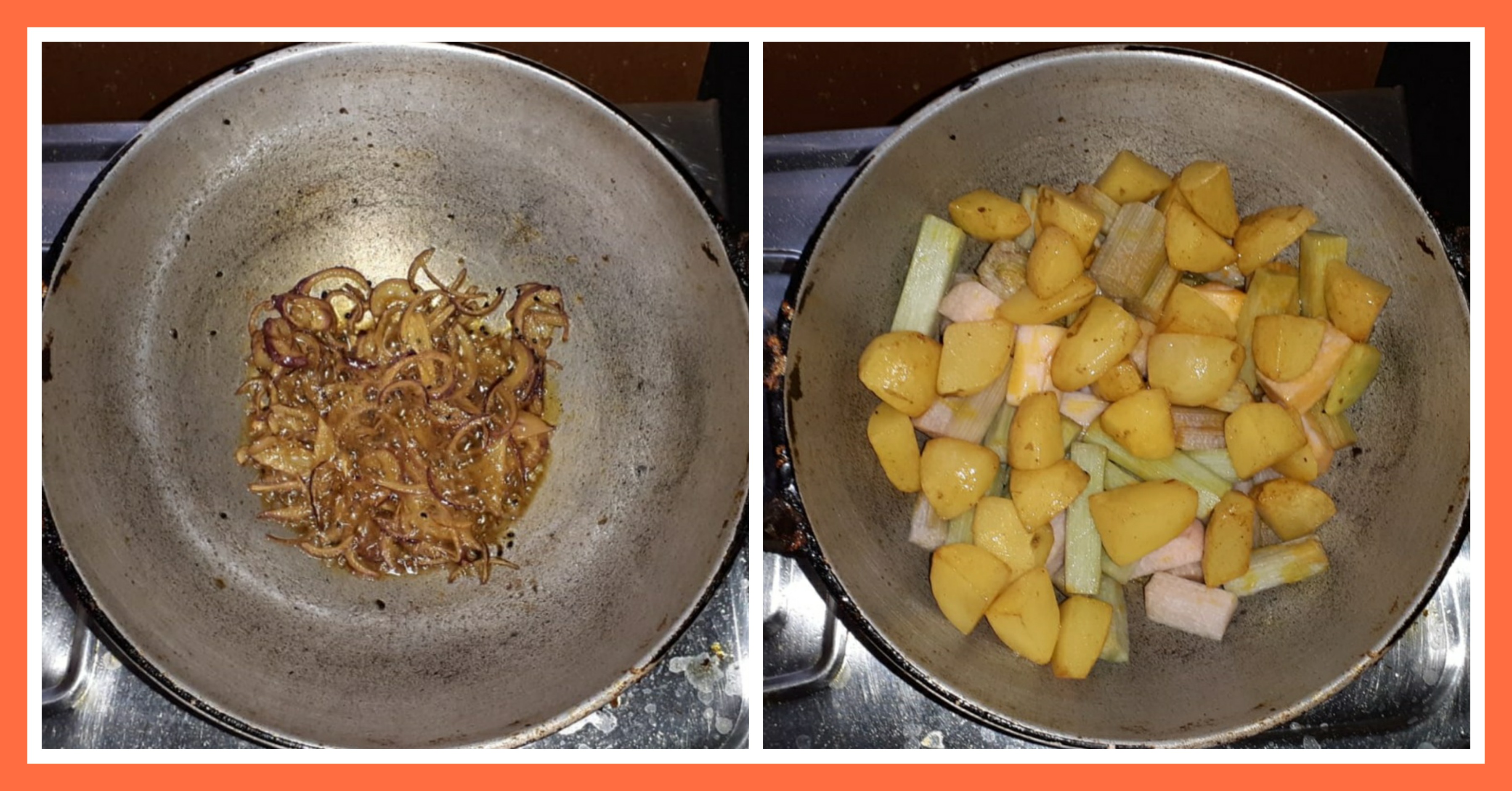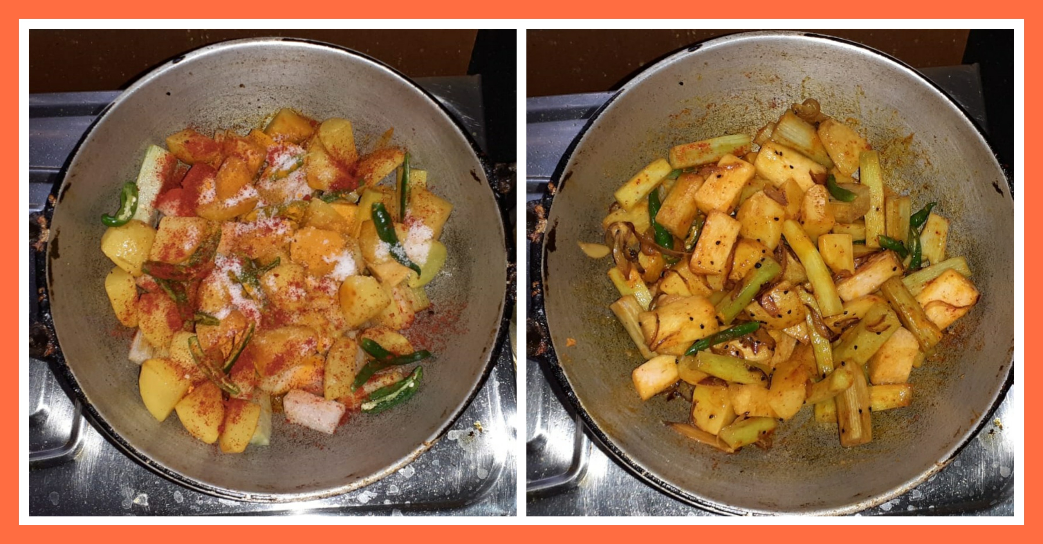 ➤পেঁয়াজ ভালো মতো ভাজা হয়ে আসলে তাতে ভেজে রাখা আলু সব দিয়ে দিয়েছিলাম এবং সাথে ওলের ডাঁটাগুলো দিয়ে দিয়েছিলাম।