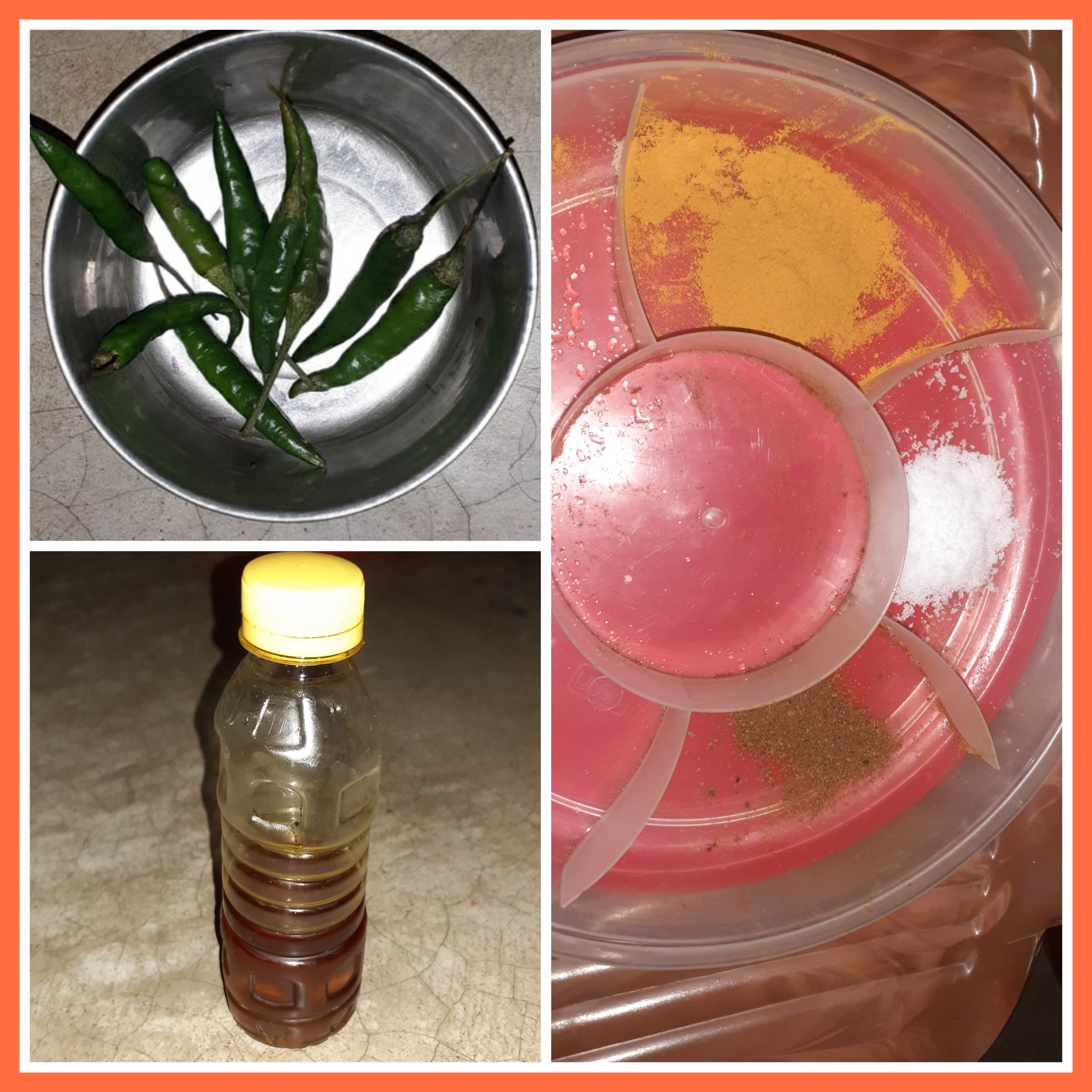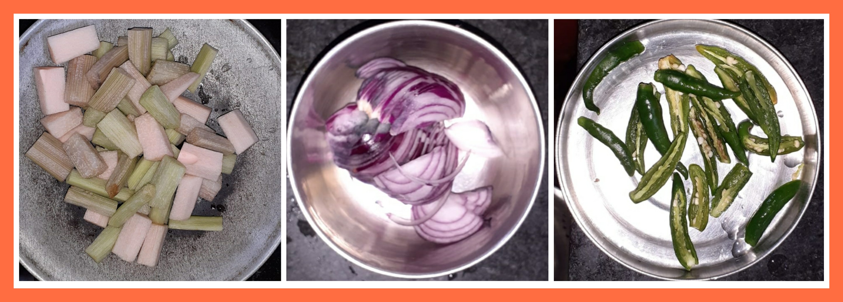 ➤ওলের ডাঁটাগুলোর উপরের ছাল মতো অংশটা ফেলে দেওয়ার পরে মাঝখান দিয়ে চাকা করে নিয়েছিলাম এবং পরে ছোট ছোট পিচ করে নিয়েছিলাম। এরপর পেঁয়াজ এর খোসা ছাড়িয়ে নেওয়ার পরে কেটে কুচি করে নিয়েছিলাম। কাঁচা লঙ্কাগুলো কেটে নেওয়ার পর ধুয়ে নিয়েছিলাম।