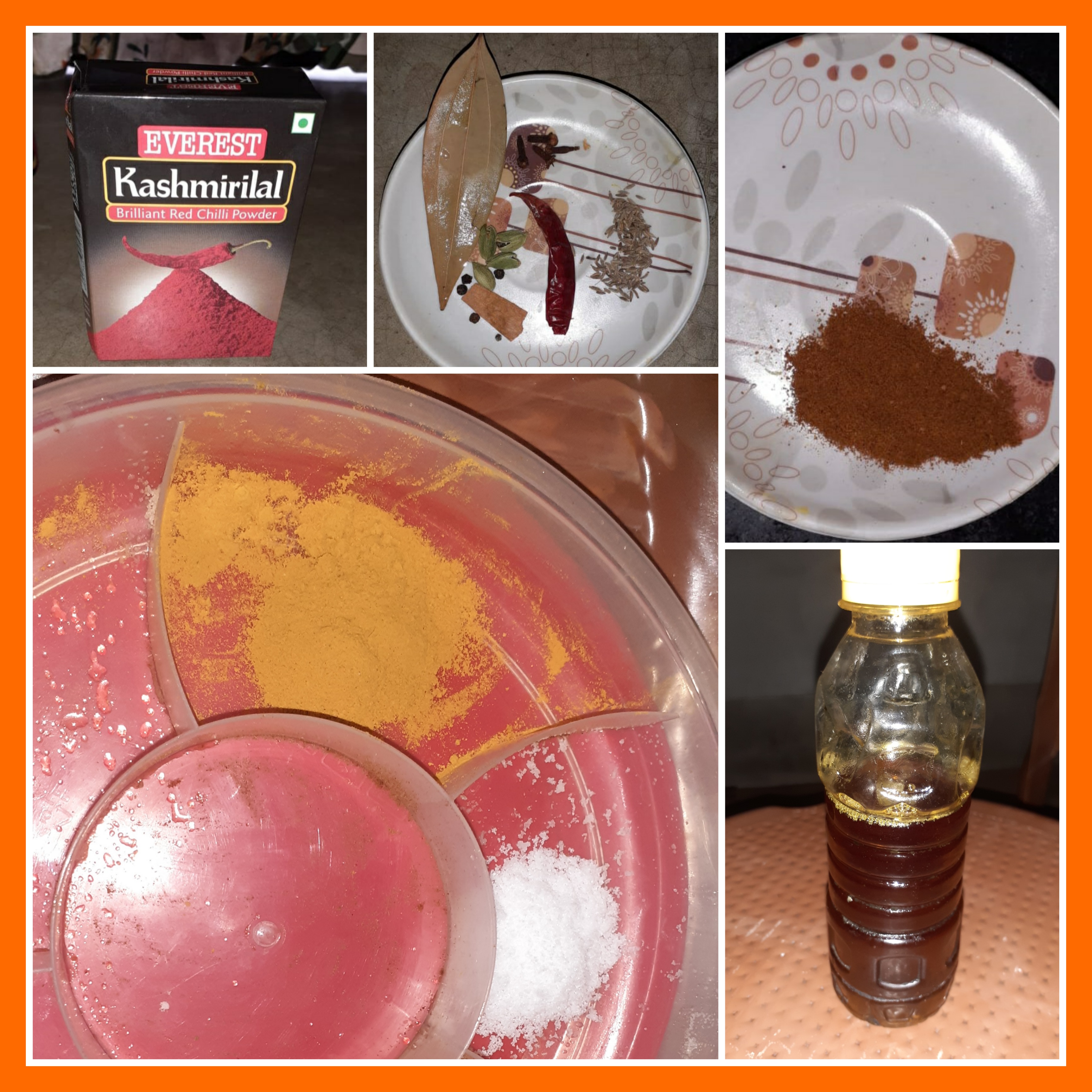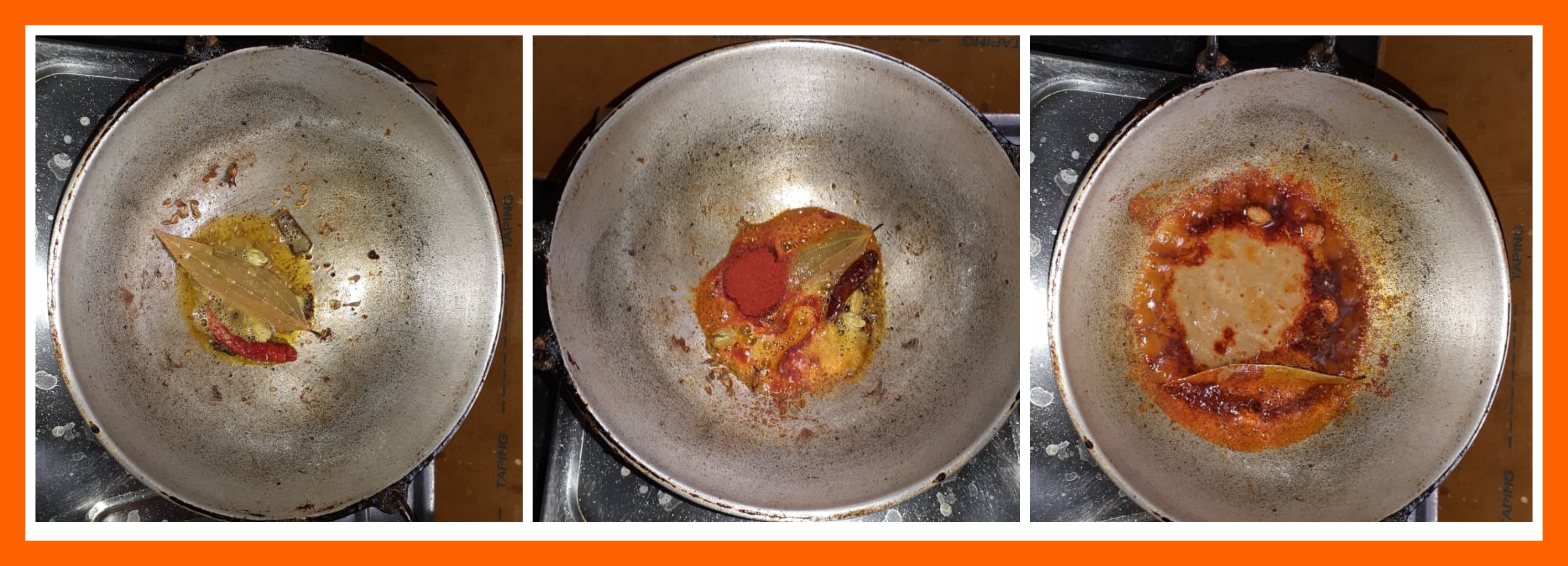 ❖কড়াইতে একটু তেল দিয়ে তাতে জিরা, মরিচ, লবঙ্গ, দারুচিনি, তেজ পাতা এবং শুকনো লঙ্কা দিয়ে দিয়েছিলাম। এরপর তাতে কাশ্মীরি লঙ্কার গুঁড়ো দিয়ে দিয়েছিলাম। টমেটো, আদা আর কাঁচা লঙ্কার তৈরি পেস্টটি দিয়ে দিয়েছিলাম। এরপর মশলা সহ অল্প কিছুক্ষন ধরে কষিয়ে নিয়েছিলাম।