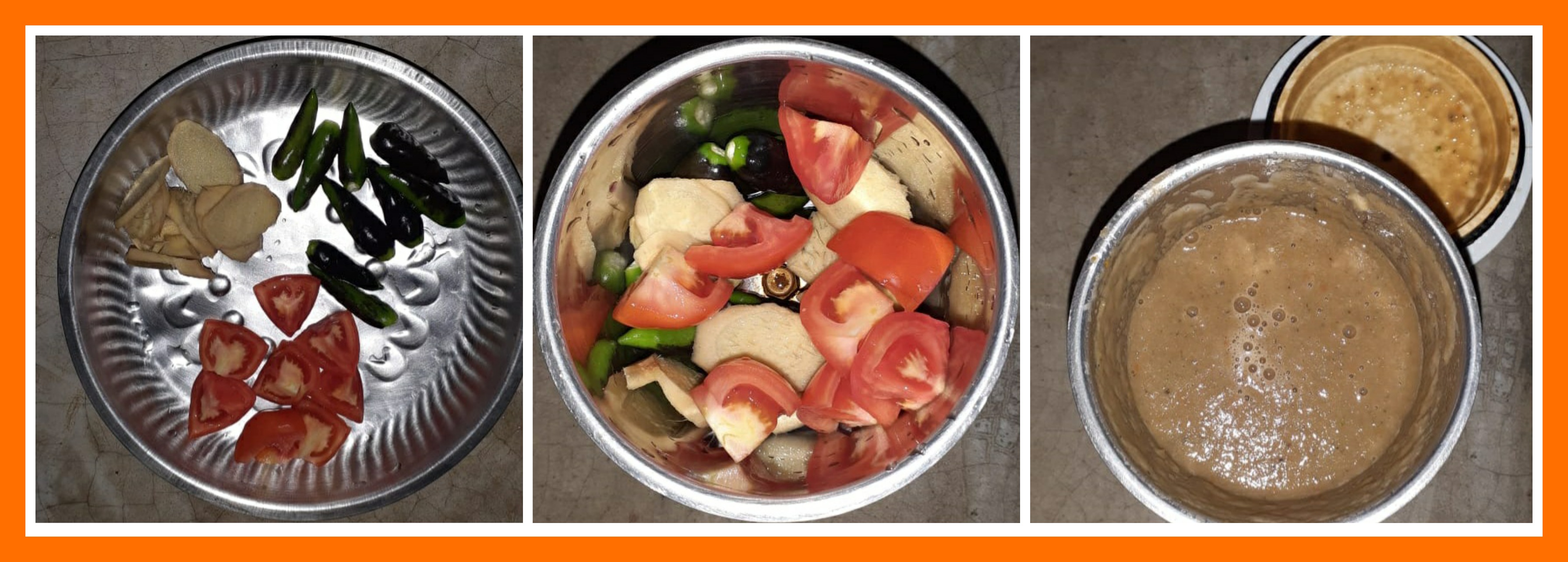 ❖টমেটো কেটে নিয়েছিলাম এবং সাথে আদার খোসা ছালিয়ে কেটে নিয়েছিলাম। কাঁচা লঙ্কাগুলো জল দিয়ে ধুয়ে নিয়েছিলাম। এরপর সবগুলো মিক্সারের বাটিতে ঢেলে দিয়েছিলাম এবং ভালো করে পেস্ট তৈরি করে নিয়েছিলাম।
