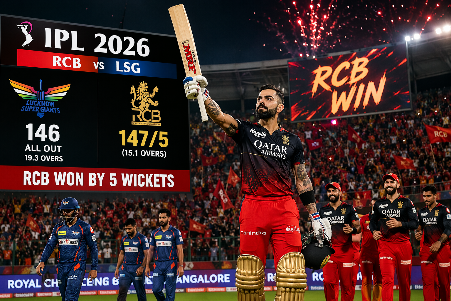 মুকুল নামের একজন যদি সামান্য কিছু এই রান না করতো, তাহলে ১২০-২৫ রান হতো। কোনোমতে একটু রান হয়েছে, ১৪৭ রান চেজ করা বেঙ্গালুরু এর কাছে সামান্য ব্যাপার। তবে ওদের ব্যাটিং দেখে মনে হচ্ছিলো যেনো, বোলিং পিচ। যাইহোক, বেঙ্গালুরু ব্যাটিং করতে নামলে শুরুটা একটু খারাপ ছিল, কারণ সল্ট আউট হয়ে গেছিল। তবে কোহলি ভালো ব্যাকআপ দিয়েছিলো, কোহলি চেজ এর ক্ষেত্রে অসাধারণ খেলে। তবে আফসোস যে, ৪৯ রান করে আউট হয়ে যায়। তবে রজত পাটিদার অধিনায়ক হিসেবে ভালোই খেলছে এই সিজনে। সবথেকে জিতেষ ভালো ব্যাটিং করেছে এই ম্যাচে, দুই বাড়ি দিয়ে ১৫ ওভারে ম্যাচ জিতিয়ে দিয়েছে।