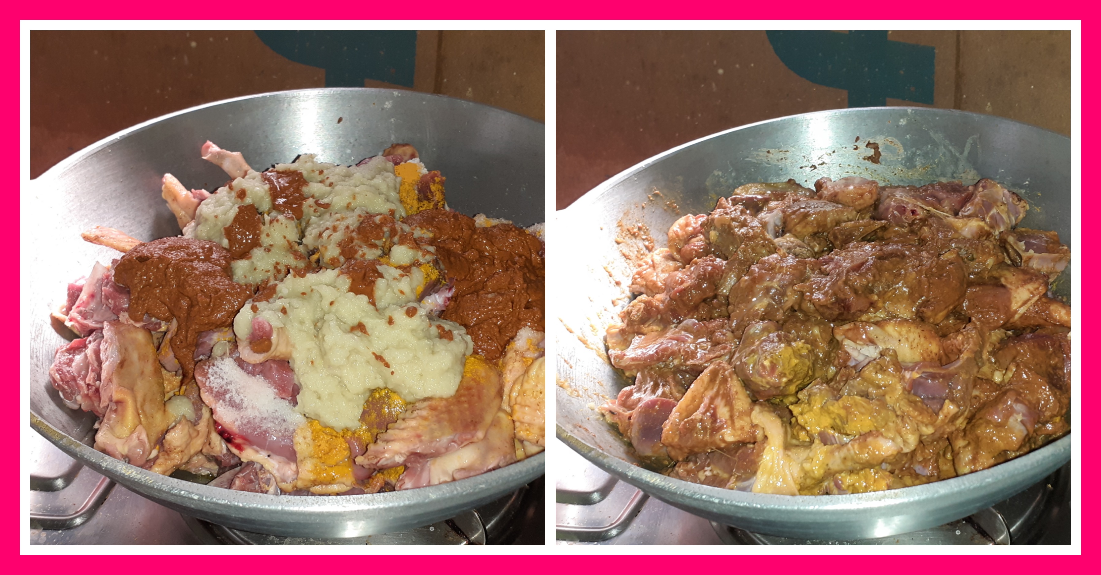 ➤মাংসগুলো দেওয়ার পরে তাতে পেস্ট করে রাখা সমস্ত মশলা আর পরিমাণমতো লবন, হলুদ দিয়ে দিয়েছিলাম। এরপর মাংসের সাথে সমস্ত মশলা উল্টেপাল্টে ভালো করে মিশিয়ে নিয়েছিলাম।