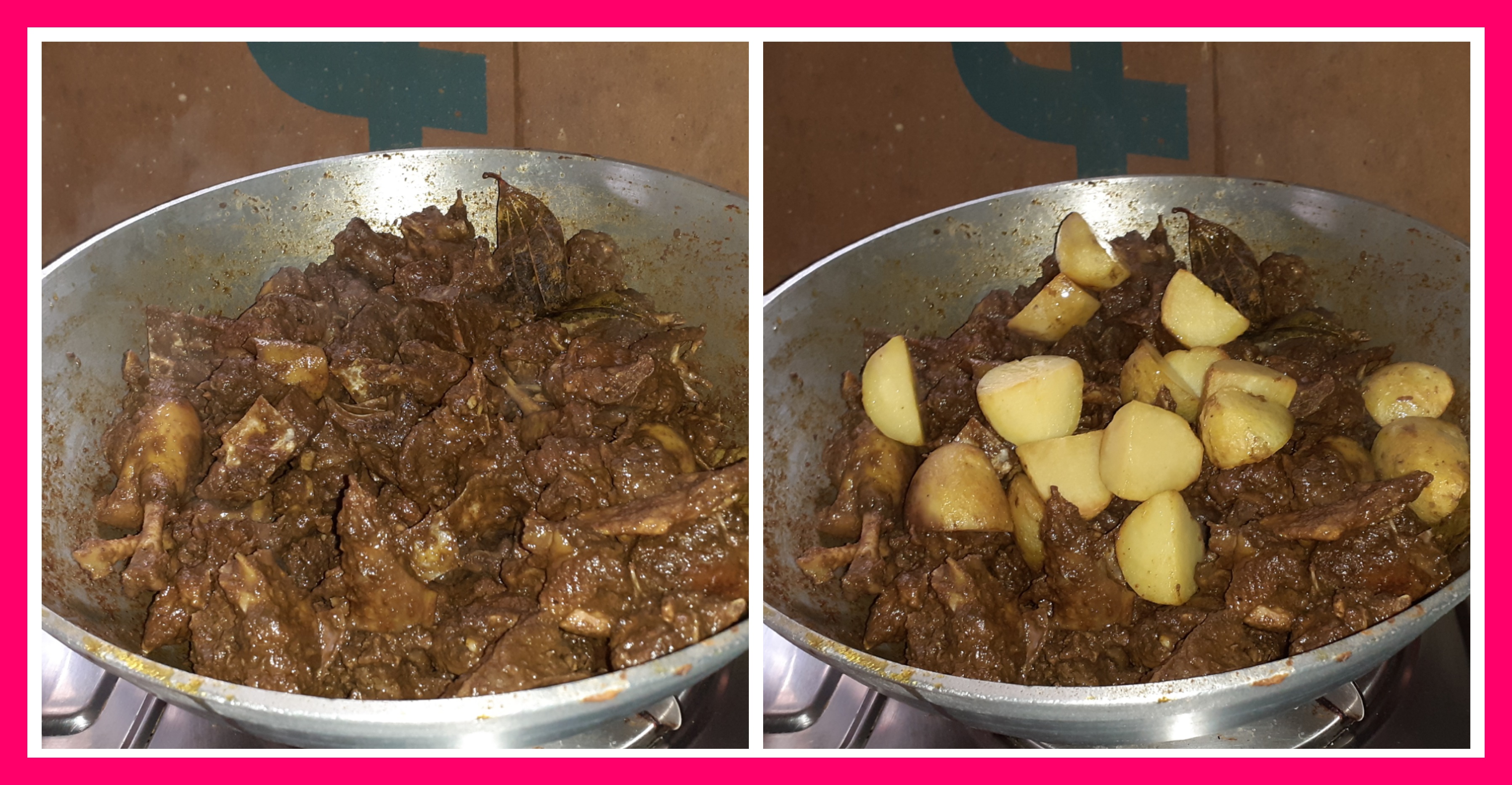 ➤মেশানোর পরে মাংসগুলো বেশ অনেক্ষন ধরে ভালোভাবে কষিয়ে নিয়েছিলাম। আর কষানোর পরে তাতে দিয়ে দিয়েছিলাম ভাজা আলুর পিচগুলো।