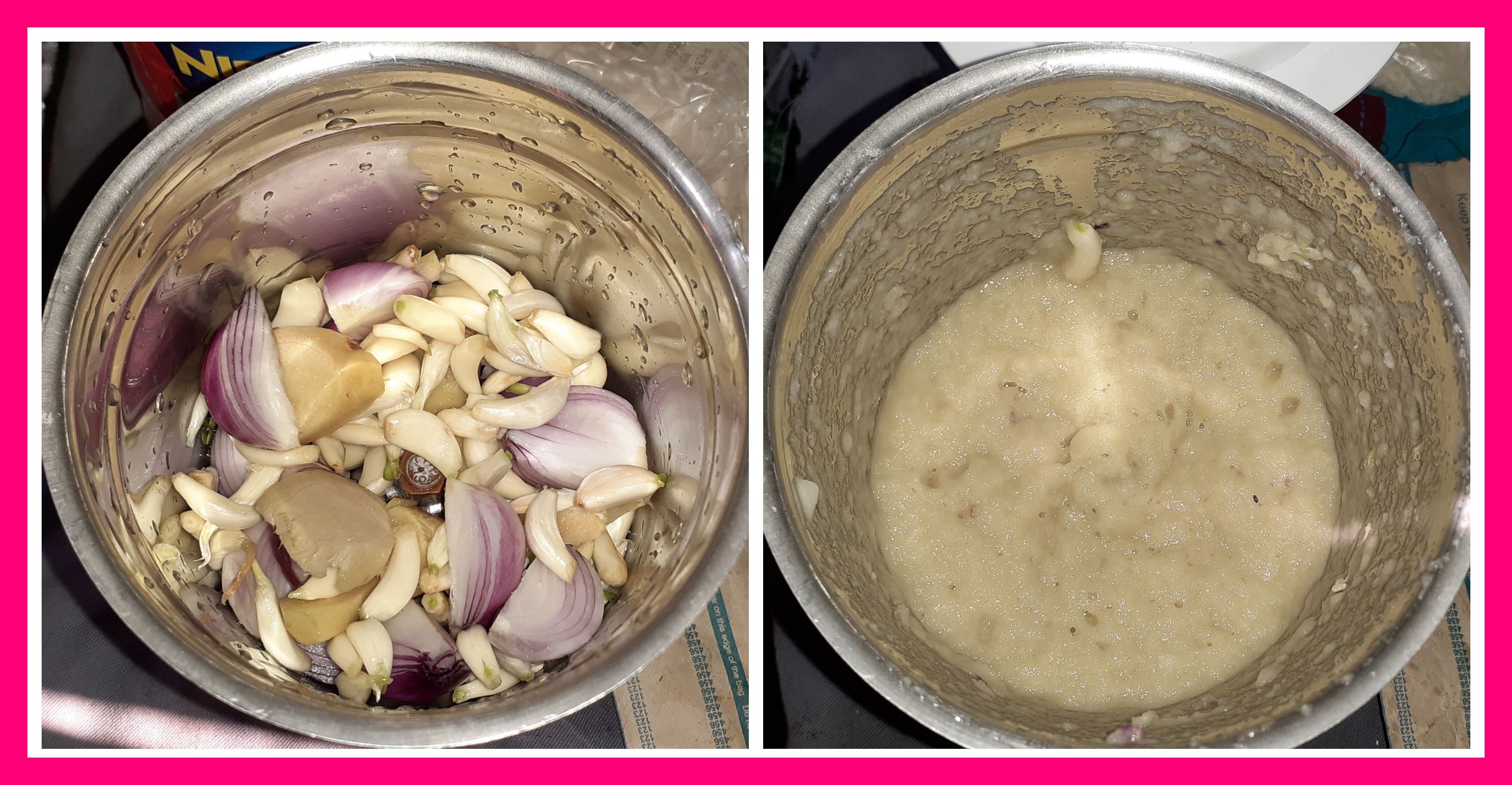 ➤পেঁয়াজ, রসুন, আদা মিক্সারে ফেলে পেস্ট তৈরি করে নিয়েছিলাম।