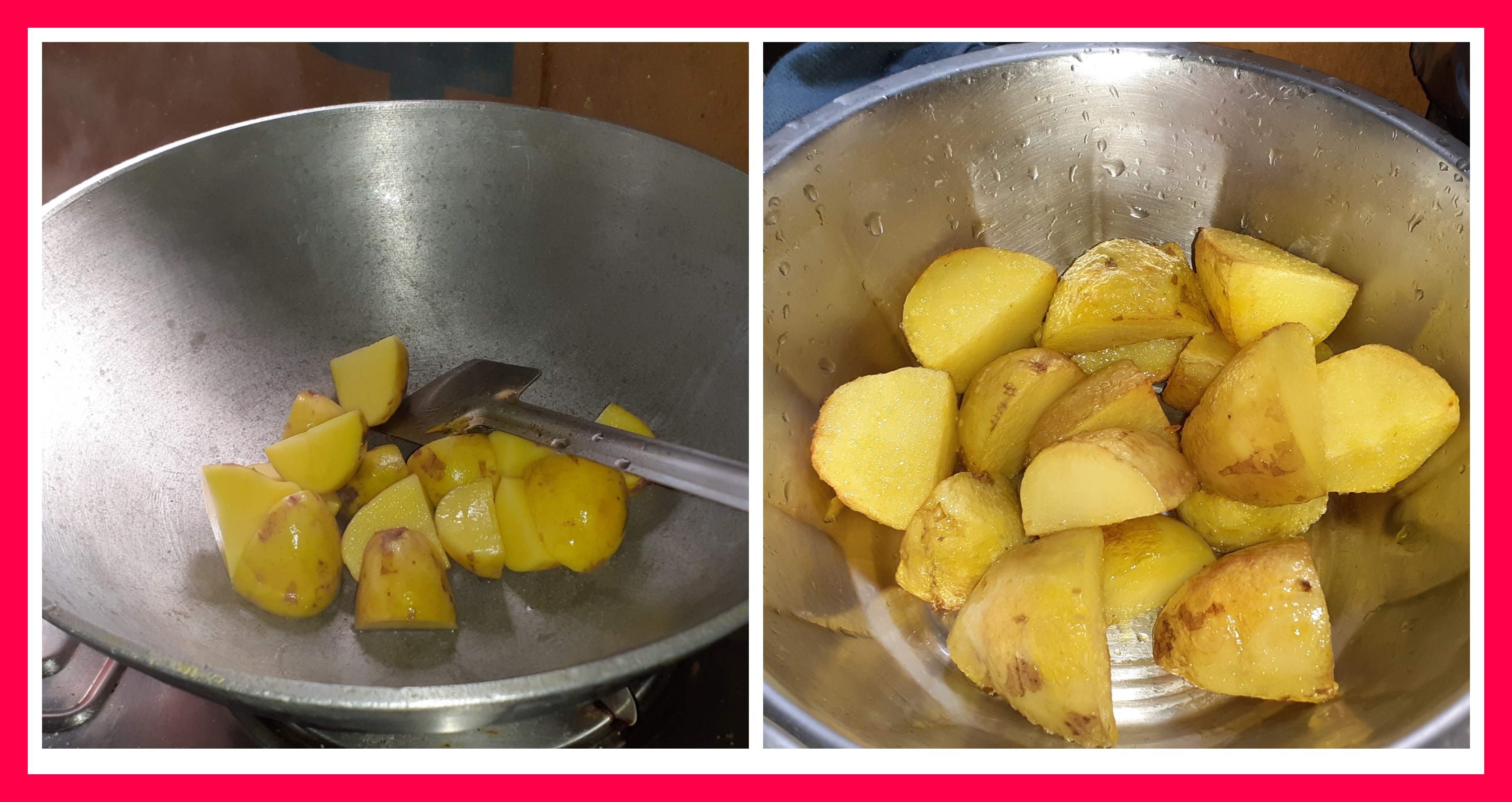 ➤কেটে রাখা আলুর পিচগুলো কড়াইতে করে ভাজা মতো করে নিয়েছিলাম।