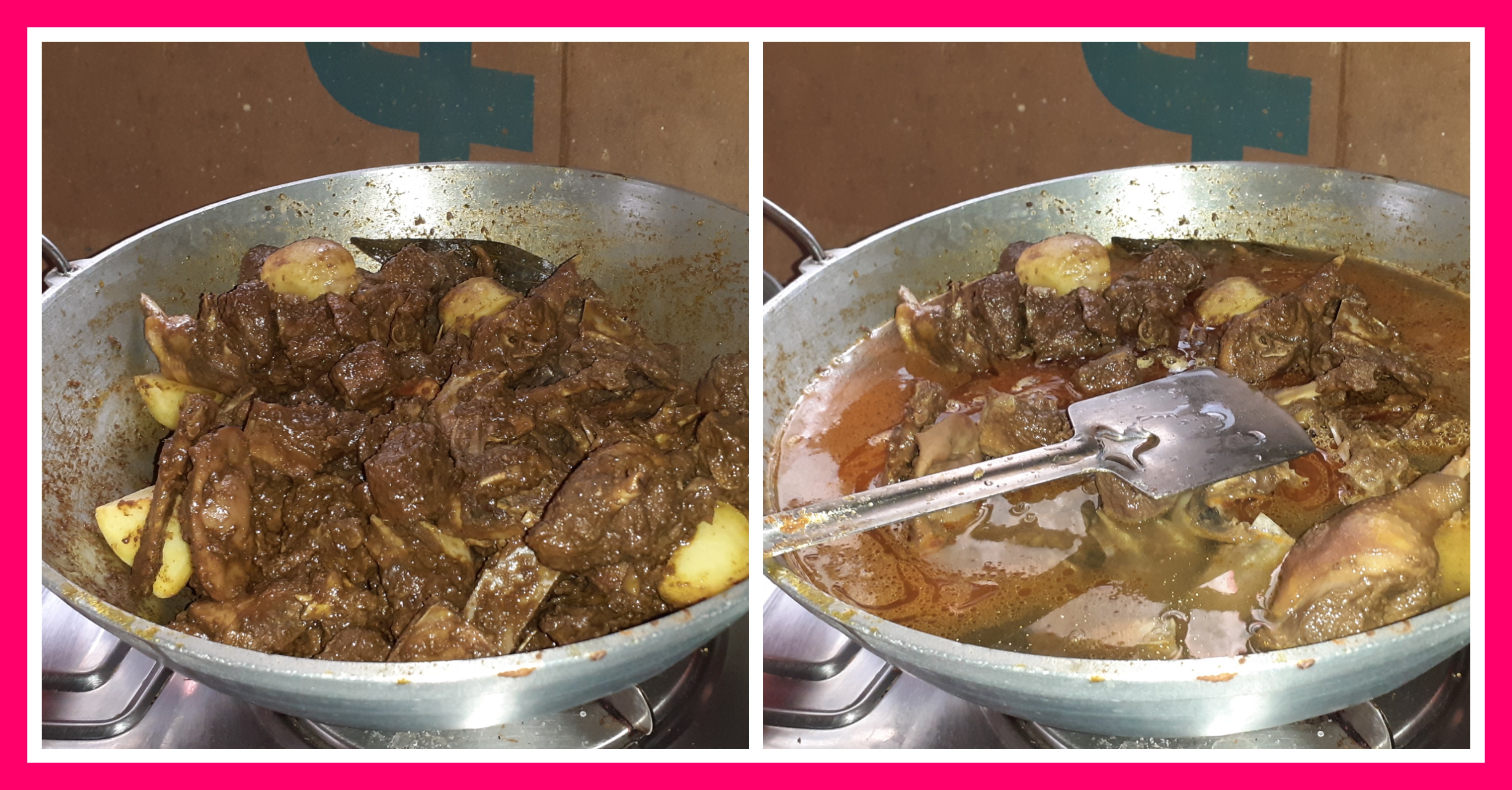 ➤আলুর পিচগুলো কষানো মাংসের সাথে মিশিয়ে নেওয়ার পরে তাতে পরিমাণমতো জল দিয়ে দিয়েছিলাম।