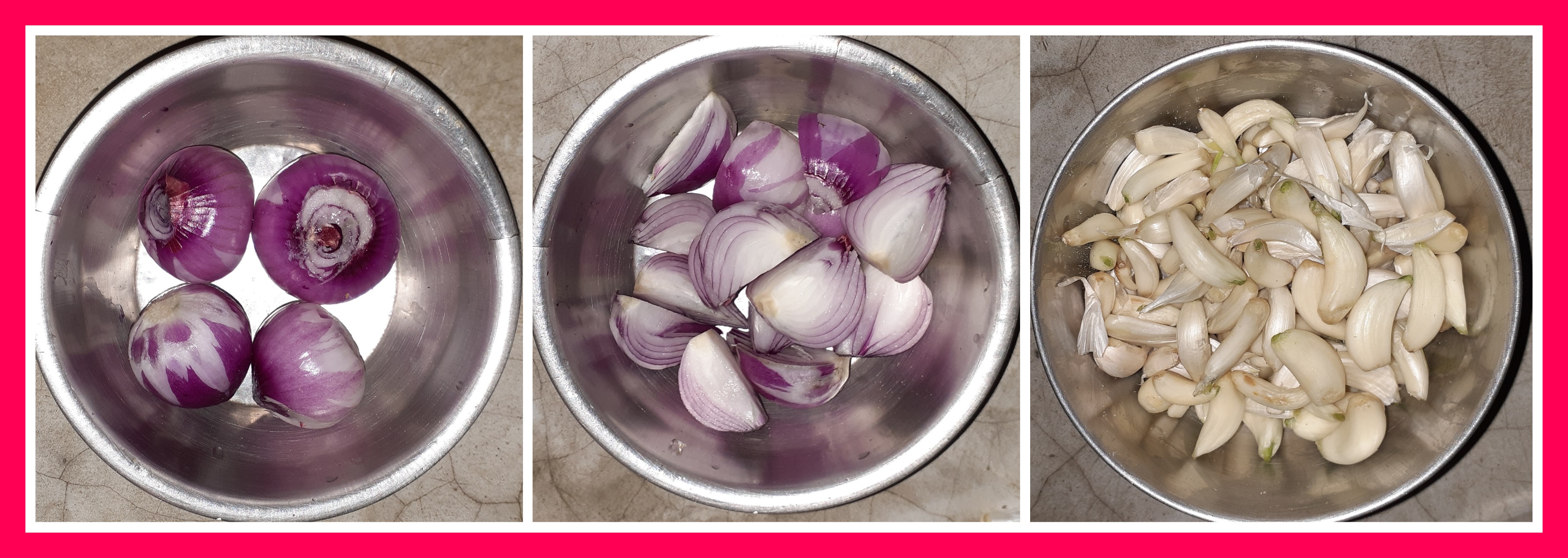 ➤পেঁয়াজ এর খোসা ছাড়িয়ে নেওয়ার পরে কেটে নিয়েছিলাম। এরপর রসুনগুলোর খোসা ছাড়ানোর পরে কোয়াগুলো আলাদা করে নিয়েছিলাম।