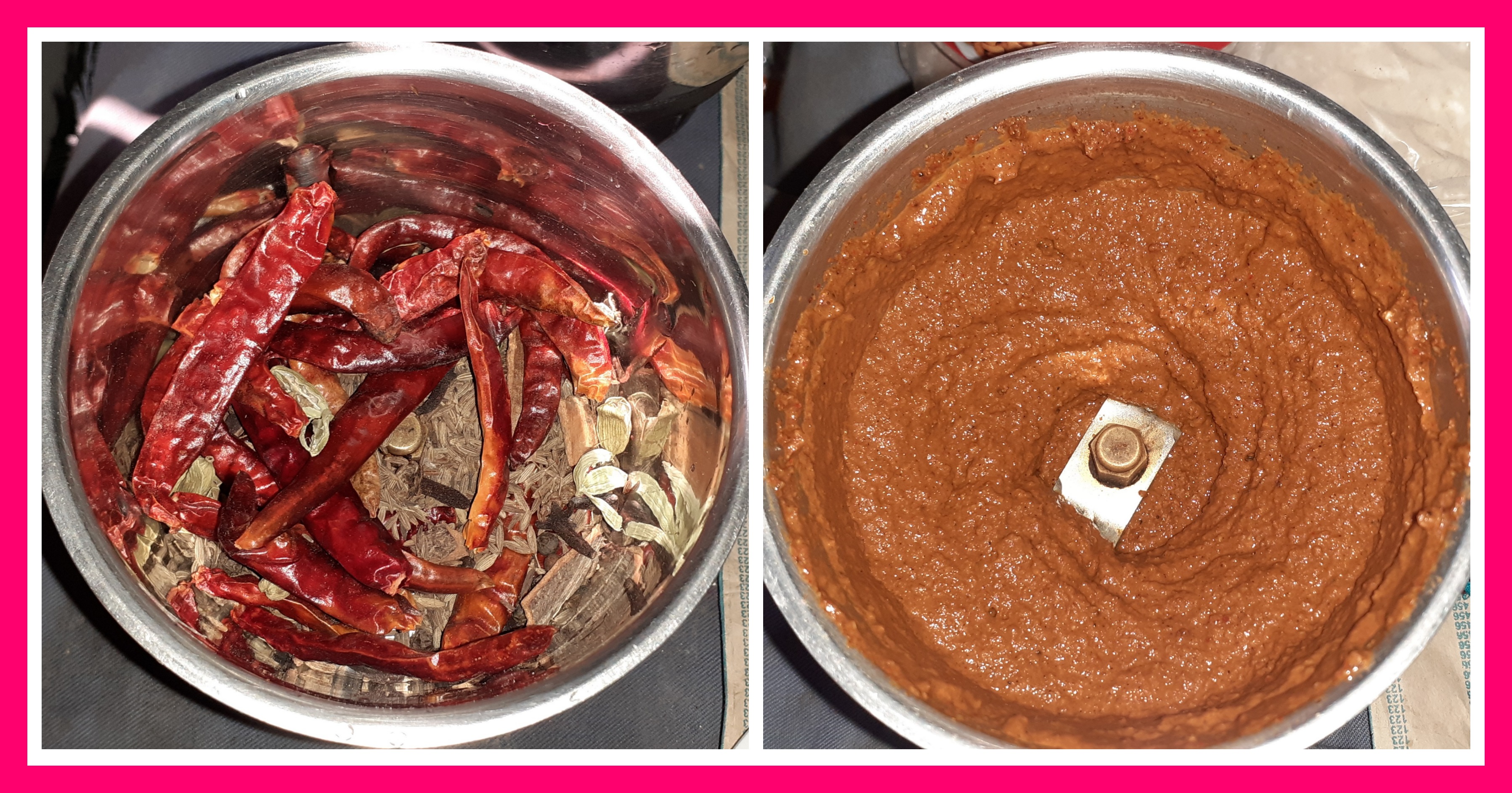 ➤জিরা, মরিচ, লবঙ্গ, দারুচিনি, শুকনো লঙ্কা মিক্সারে দিয়ে দিয়েছিলাম এবং তাতে একটু জল দিয়ে ঘুরিয়ে পেস্ট তৈরি করে নিয়েছিলাম।
