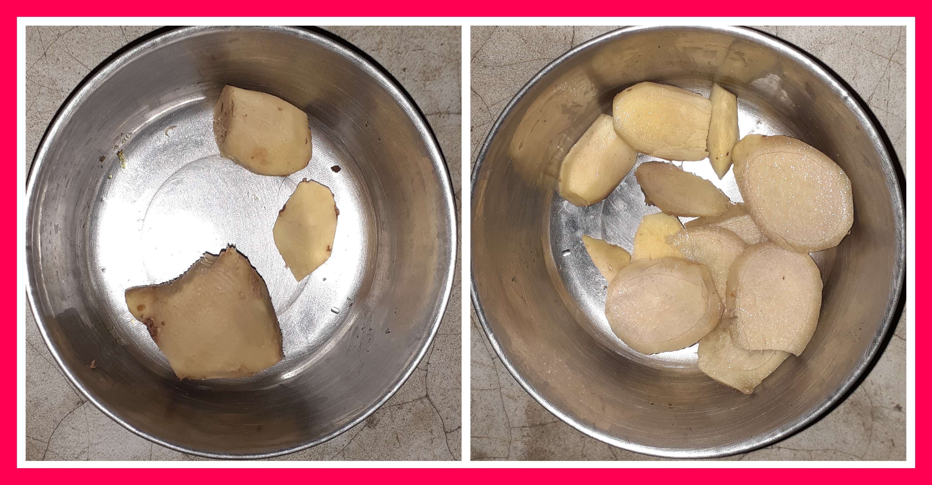 ➤আদাটির খোসা ছালিয়ে নেওয়ার পরে কেটে ছোট পিচ করে নিয়েছিলাম।