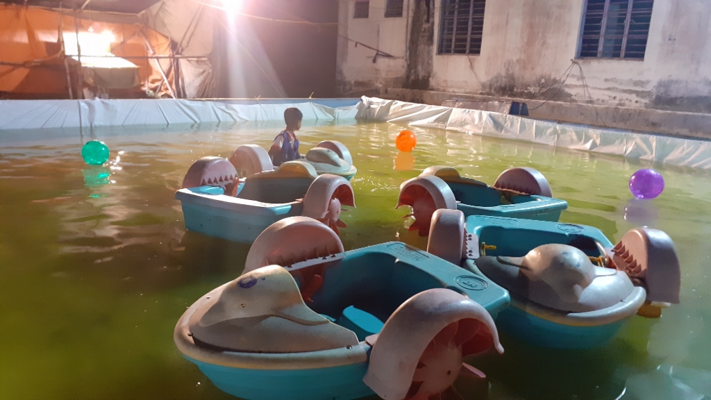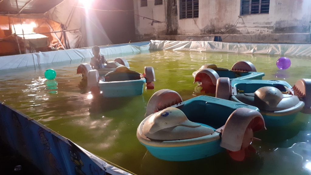যাইহোক বৈশাখী মেলায় এই বছরও যেতাম না, যাওয়াটা হলো হঠাৎ করে। আমি তো তেমন সেভাবে রেডি হয়েও যাইনি, গেছিলাম স্টেশন এর দিকে আর সেখান থেকে আসতে আসতে একজনের সাথে দেখা হলো আর সে বললো চলো মেলায় একটা পাক দিয়ে আসি কালকেইতো শেষ হয়ে যাবে। আমিও ভাবলাম চলো যাই কিছু খেয়েও আসি, আমি আবার মেলায় ঢুকলে শুধু ভাজাভুজির দিকে নজর দেই কারণ ওটা না খেলে আমার পেটের মধ্যে মোচড় দেবে 😄। আর সেদিন আবার বৃষ্টিও হয়েছিল। তো মেলায় ঢুকে দেখলাম সব ফাঁকা, লোকজন নেই, কয়েকটা দোকানপাট নিয়ে বসে আছে। তারপর ভিতরের দিকে ঢুকে দেখি বাচ্চারা জলের উপরে প্লাস্টিকের বোটে করে আনন্দ করছে, দেখতে বেশ ভালোই লাগছিলো দৃশ্যগুলো।