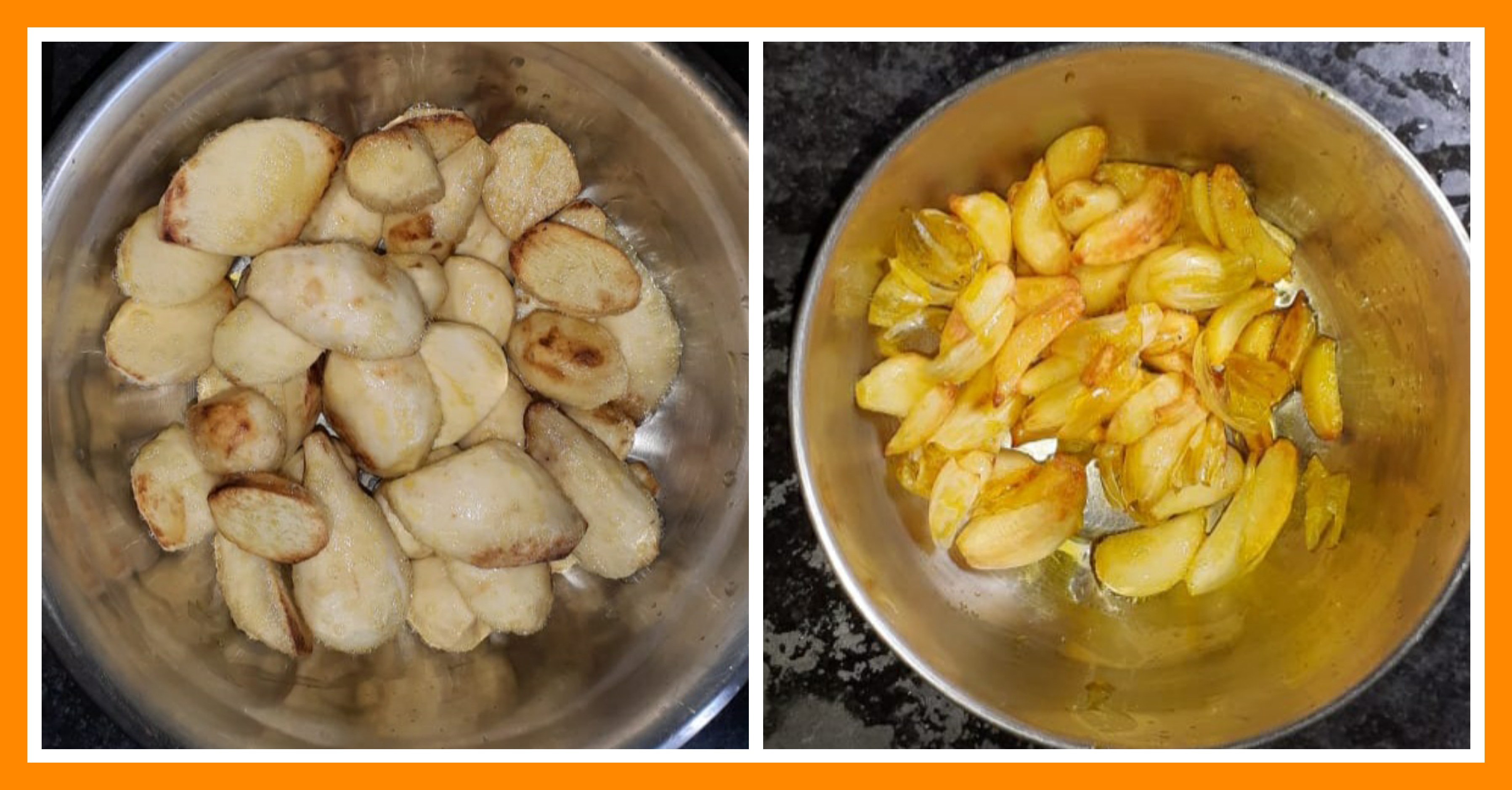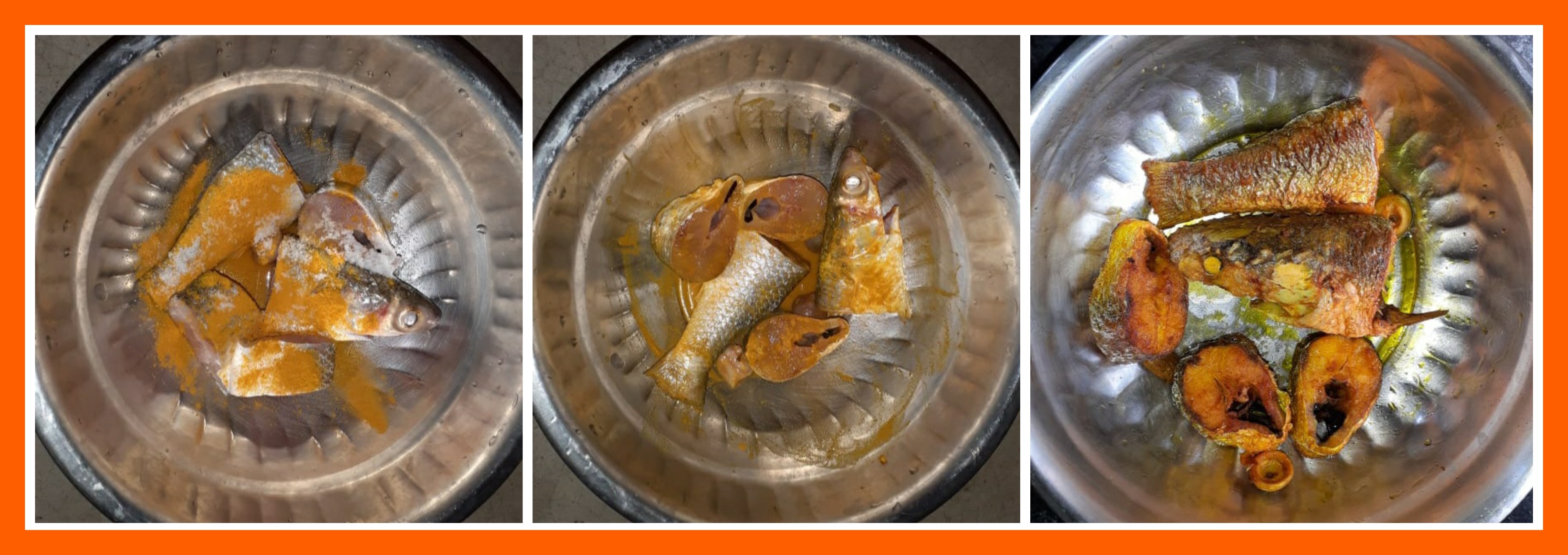 ➤কেটে রাখা ভাঙ্গাল মাছের পিচগুলোতে লবন, হলুদ দিয়ে দিয়েছিলাম। এরপর গায়ে মাখিয়ে নেওয়ার পরে ভালো করে ভেজে নিয়েছিলাম।