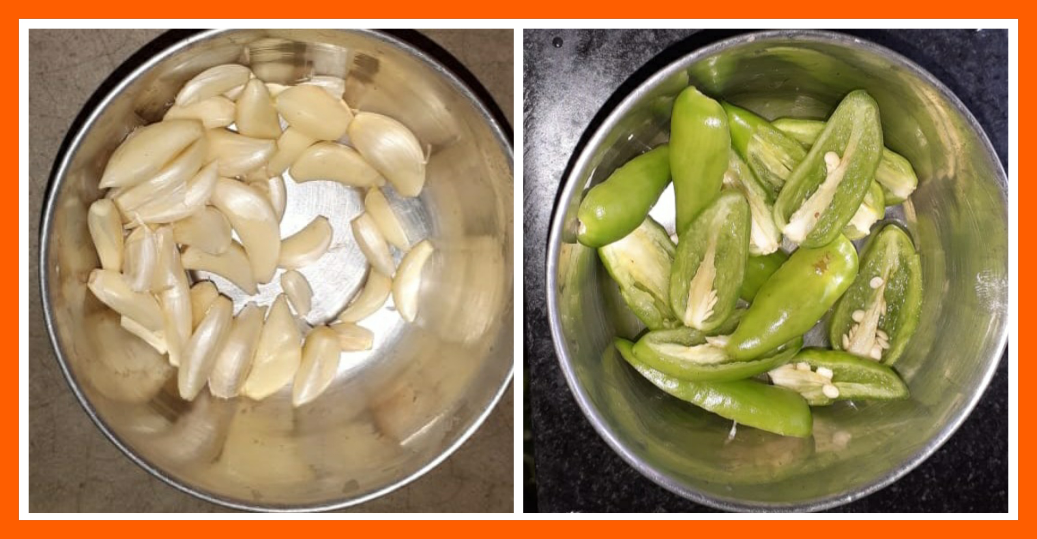 ➤রসুনের খোসা ছাড়িয়ে নেওয়ার পরে কোয়াগুলো আলাদা করে নিয়েছিলাম। এরপর কাঁচা লঙ্কাগুলো কেটে নেওয়ার পরে ধুয়ে নিয়েছিলাম।