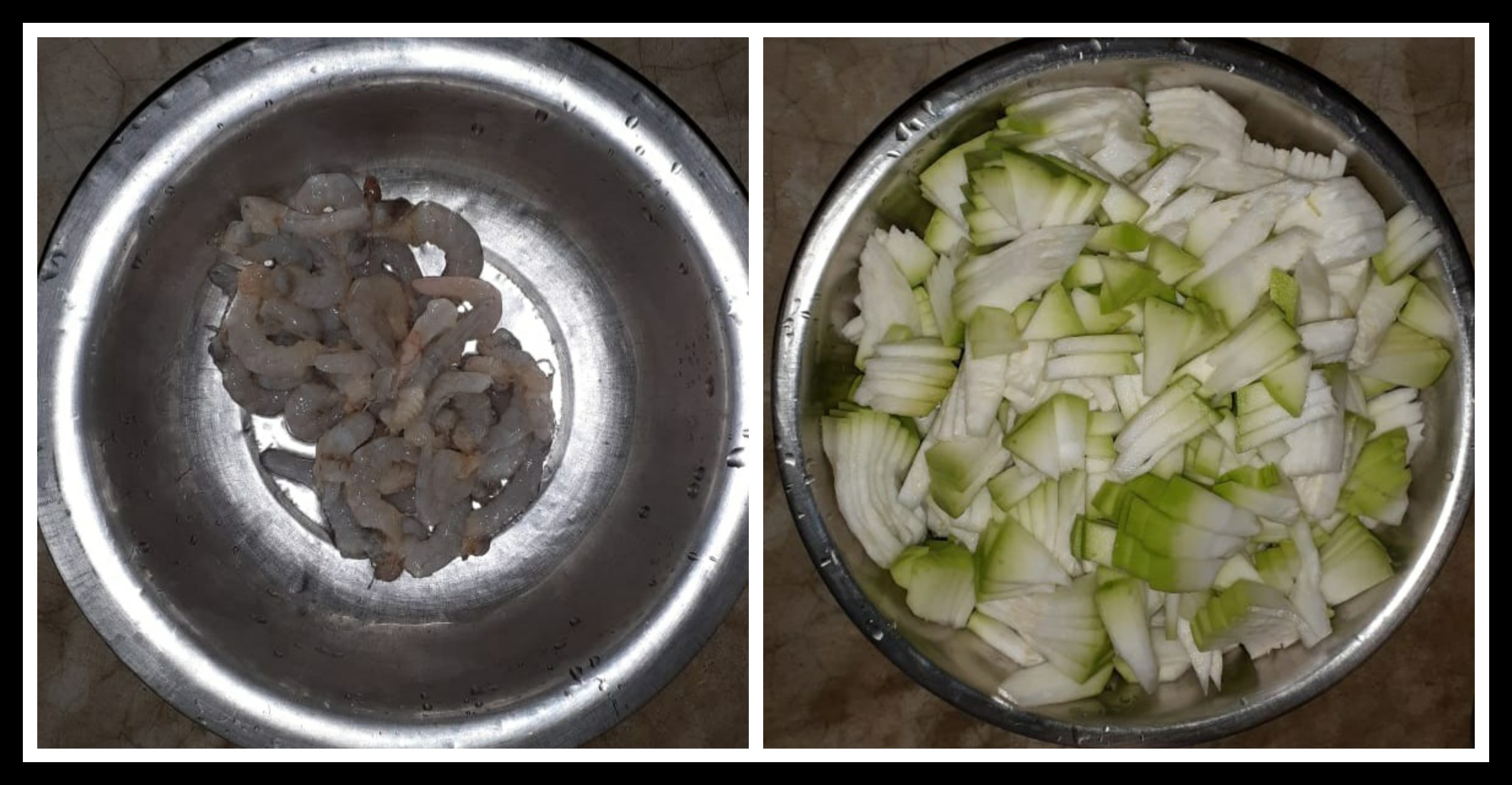 ❖চিংড়ি মাছগুলোকে প্রথমে ভালো করে কেটে কুটে জল দিয়ে ধুয়ে পরিষ্কার করে নিতে হবে। এরপর আমি লাউ ভালো করে কেটে নিয়েছিলাম এবং পরে জল দিয়ে ধুয়ে নিয়েছিলাম।