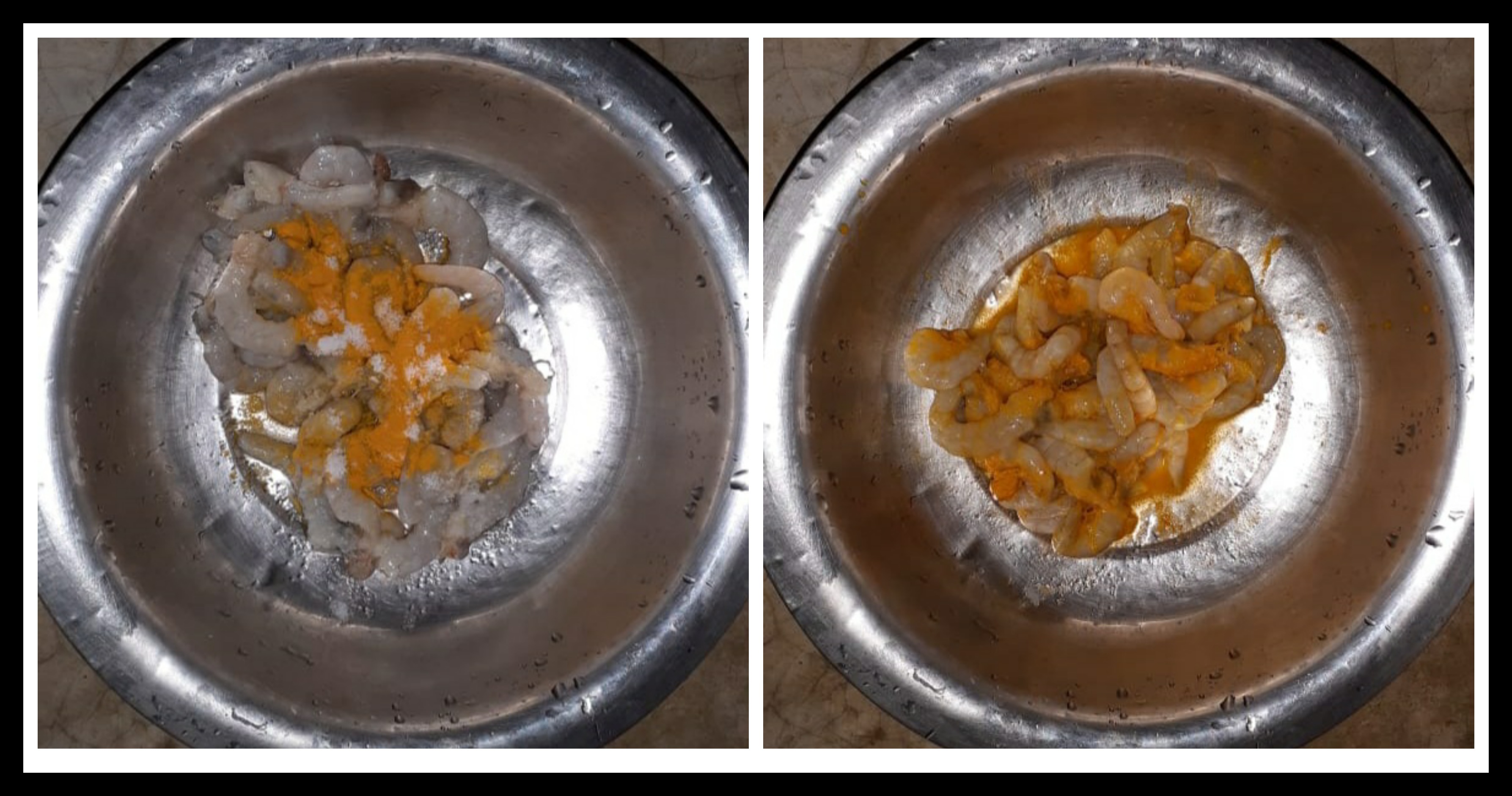 ❖কেটে রাখা চিংড়ি মাছের গায়ে ১চামচ লবন ও হলুদ দিয়ে ভালো করে মাখিয়ে নিয়েছিলাম।