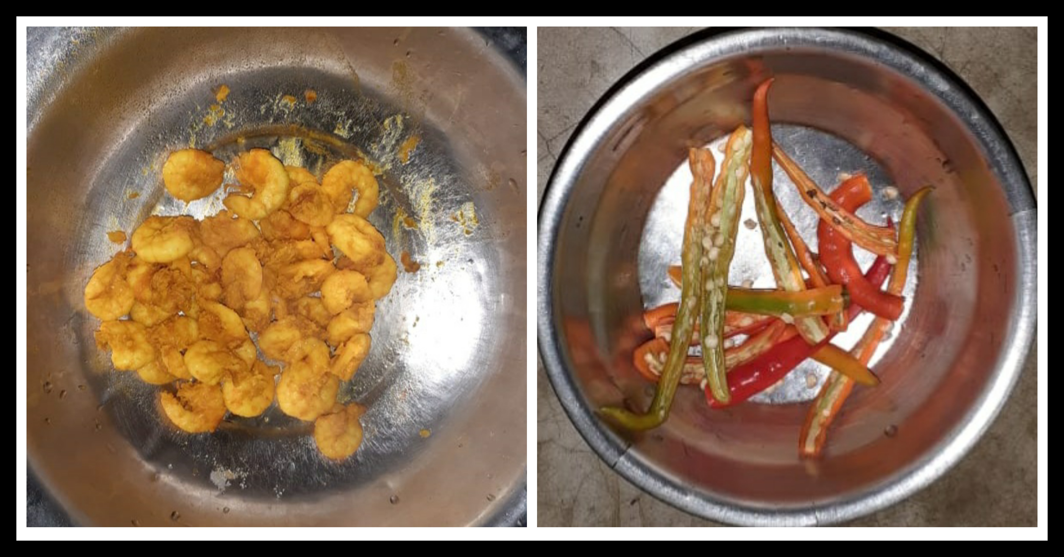 ❖চিংড়িগুলো ভালো করে ভেজে নেওয়ার পরে ঝটপট অল্প কয়েকটা লঙ্কা কেটে নিয়েছিলাম।