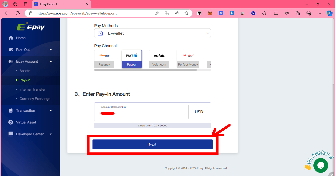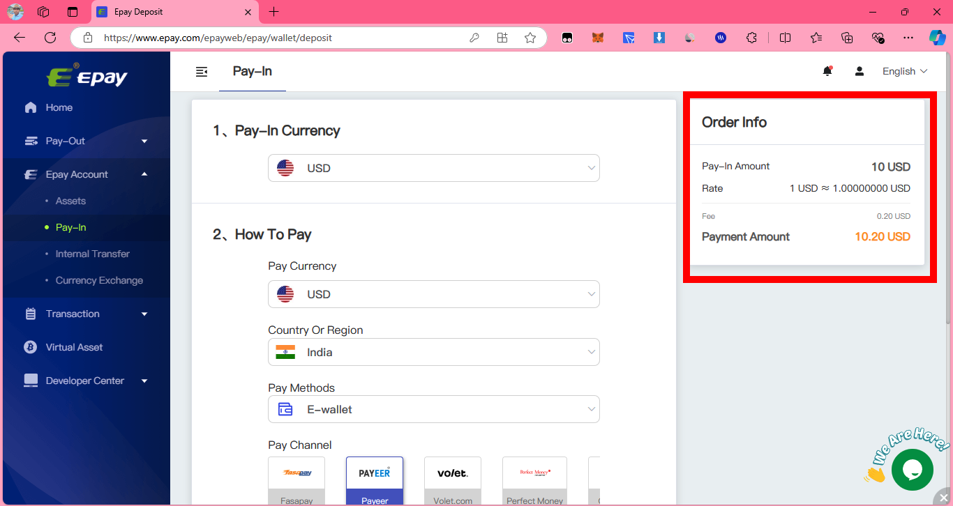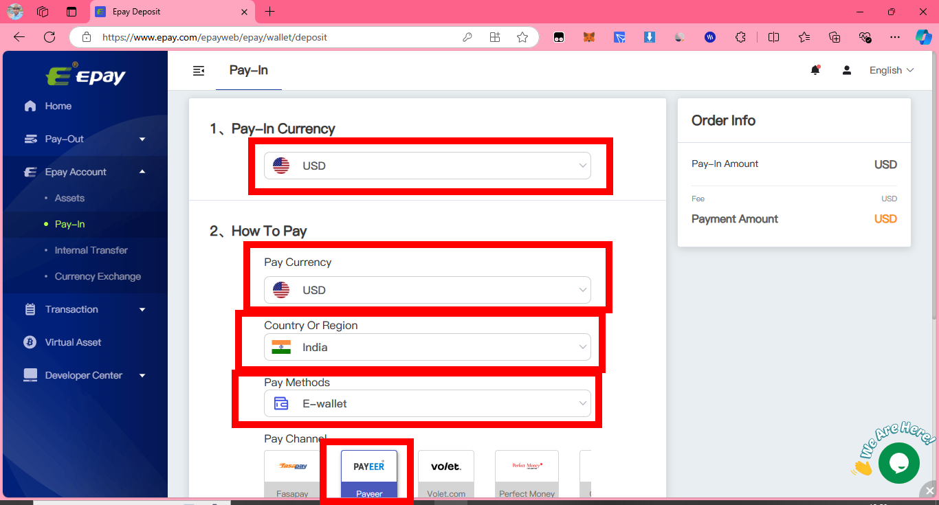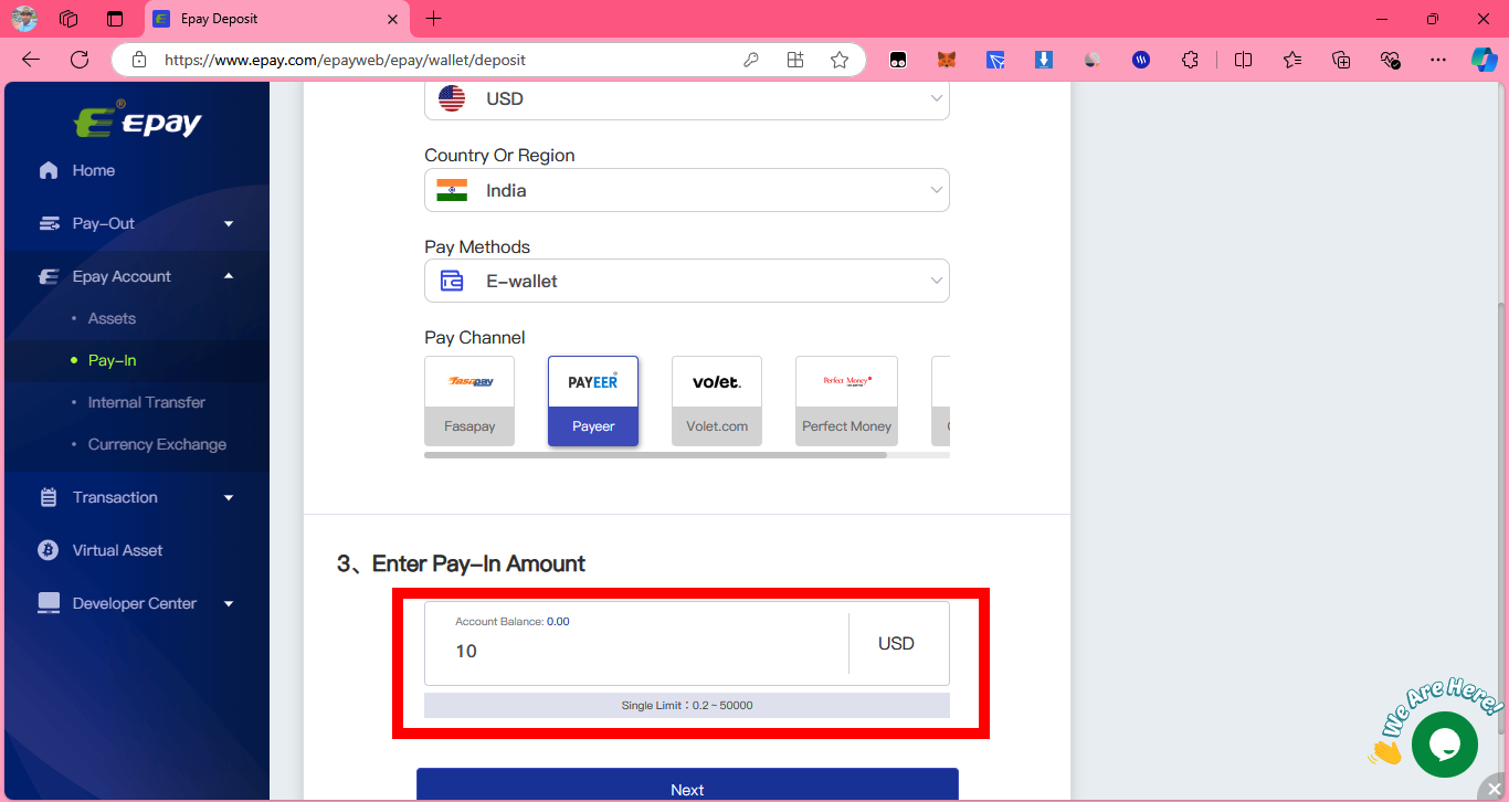 ✔এরপর আপনি Pay-In currency-তে যে currency এর ব্যালেন্স আনতে চাইছেন সেই currency সিলেক্ট করতে হবে। যেমন আমি USD আনবো তাই USD সিলেক্ট করলাম। এরপর দ্বিতীয় নম্বর অপশনে আপনাকে pay টা কিসের মাধ্যমে নিতে চাইছেন সেটা সিলেক্ট করতে হবে অর্থাৎ আপনি USD থেকে INR বা BDT যেটাতে নিতে চাইছেন সেটা আপনার দেশ হিসেবে সিলেক্ট করতে হবে। এরপর pay methods এর ক্ষেত্রে E-Wallet সিলেক্ট করে নেবেন। এরপর আপনি কোন E-Wallet এর মাধ্যমে আনতে চাইছেন সেটা সিলেক্ট করতে হবে। আমি PAYEER সিলেক্ট করে নিলাম।