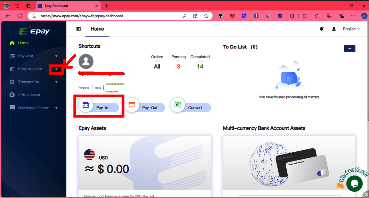 ✔Epay ওয়ালেট ওপেন করার পরে HOME পেজে চলে যাবেন এবং Pay-In অপশনে ক্লিক করতে হবে। অথবা আপনারা বাম পাশের Epay account এর ড্রপ ডাউন মেনুতে ক্লিক করলেও এই Pay-In অপশনটি পেয়ে যাবেন। এরপর ওই Pay-In অপশনে ক্লিক করতে হবে।