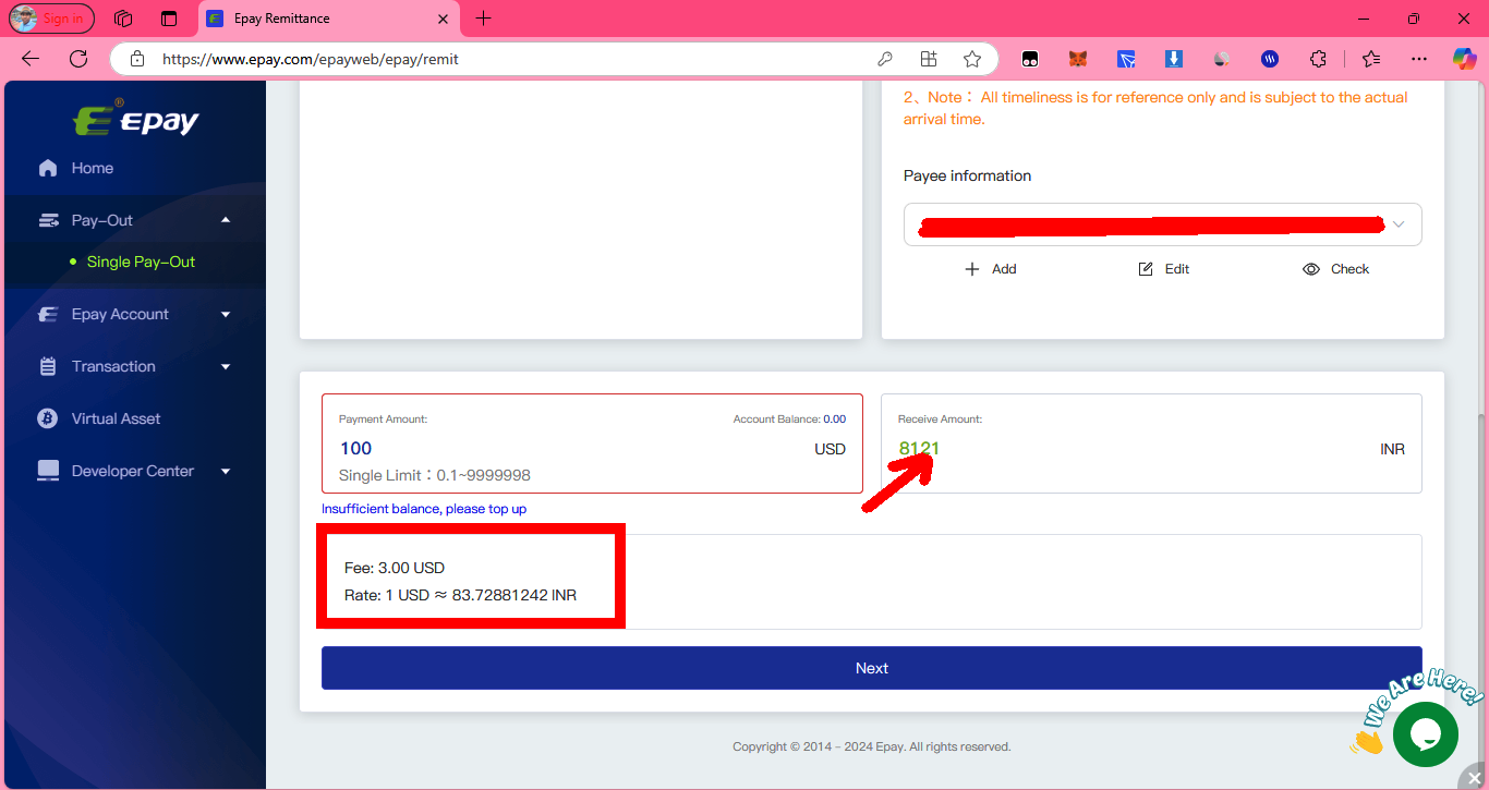 ➤এইবার আপনি কত ডলার উইথড্র দিতে চাইছেন সেই এমাউন্টটা বসাতে হবে। আমি ১০০ USD বসিয়ে দেখালাম। এমাউন্ট বসালেই আপনার কান্ট্রি বেস যে রেট আছে সেই হিসেবে আপনার রিসিভ এমাউন্টটাও দেখিয়ে দেবে FEE সহ।