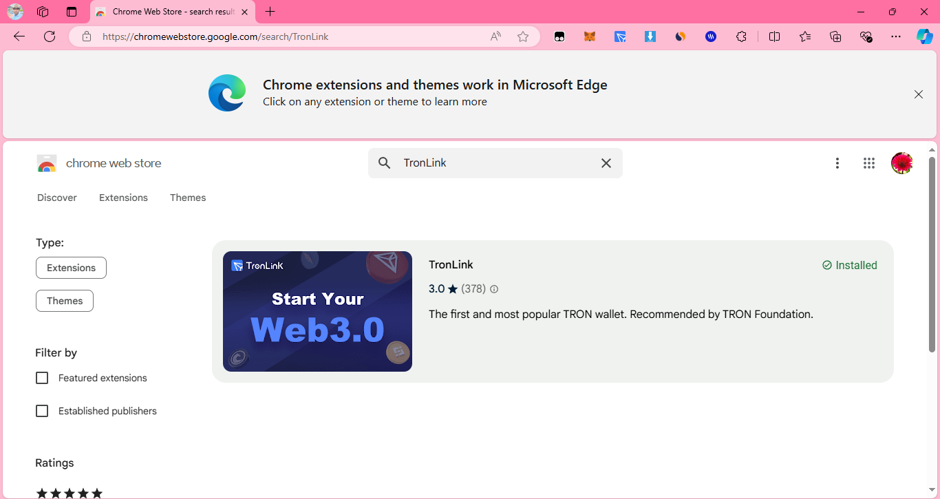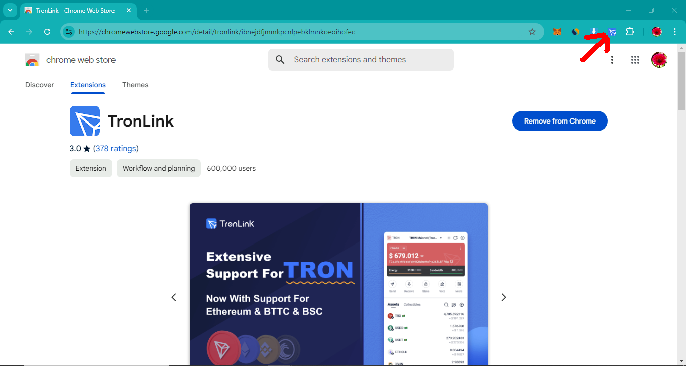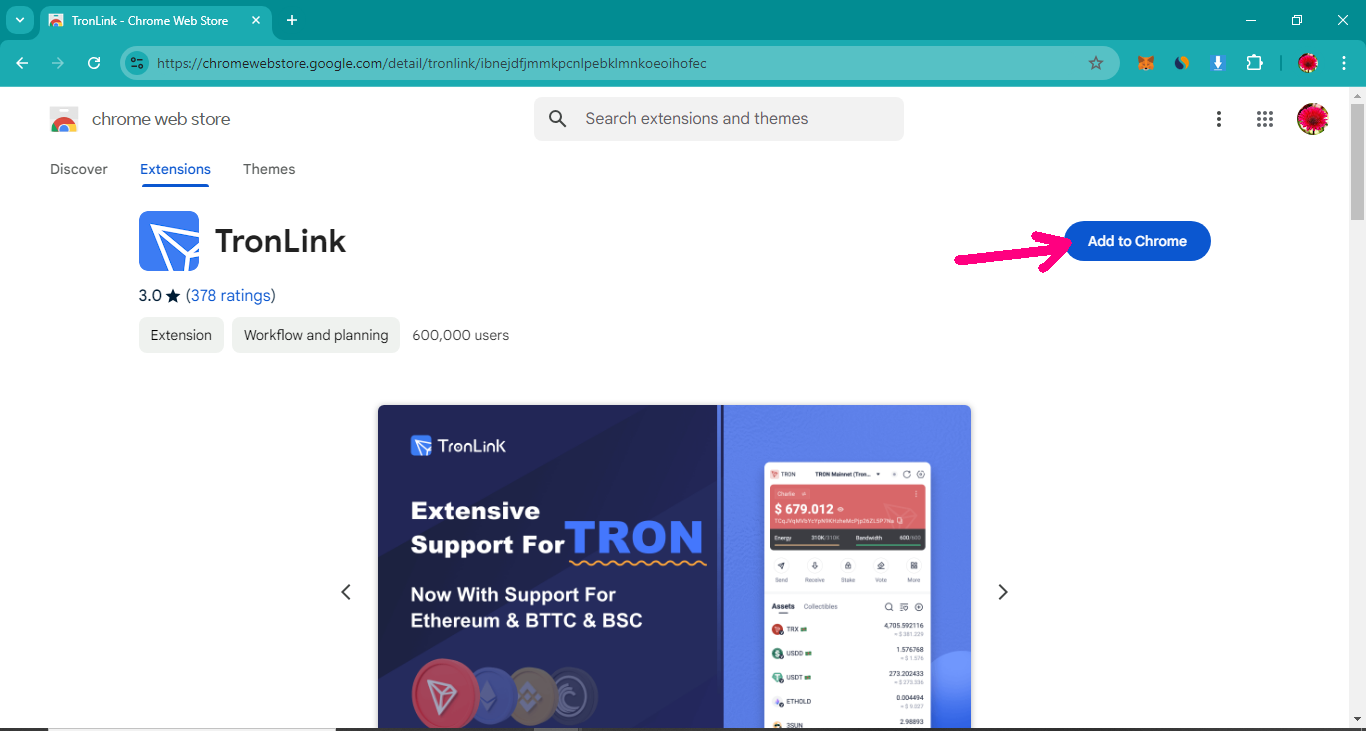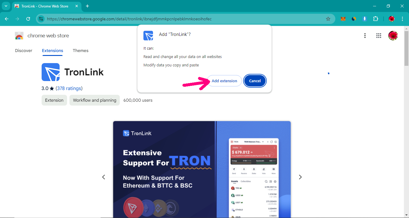 ✔TronLink এর উপর ক্লিক করলে 'অ্যাড টু ক্রোম' লেখা অপসন আসবে এবং ওটাতে ক্লিক করলে একটা পপ আপ উইন্ডো ওপেন হবে, যেখানে 'অ্যাড এক্সটেনশন' লেখাটিতে ক্লিক করলে ডাউনলোড হয়ে আপনার ক্রোম এক্সটেনশনে অ্যাড হয়ে যাবে। আর ফোনে TronLink pro লিখে সার্চ দিলেও পেয়ে যাবেন এবং সহজেই ইনস্টল করে নিতে পারবেন।