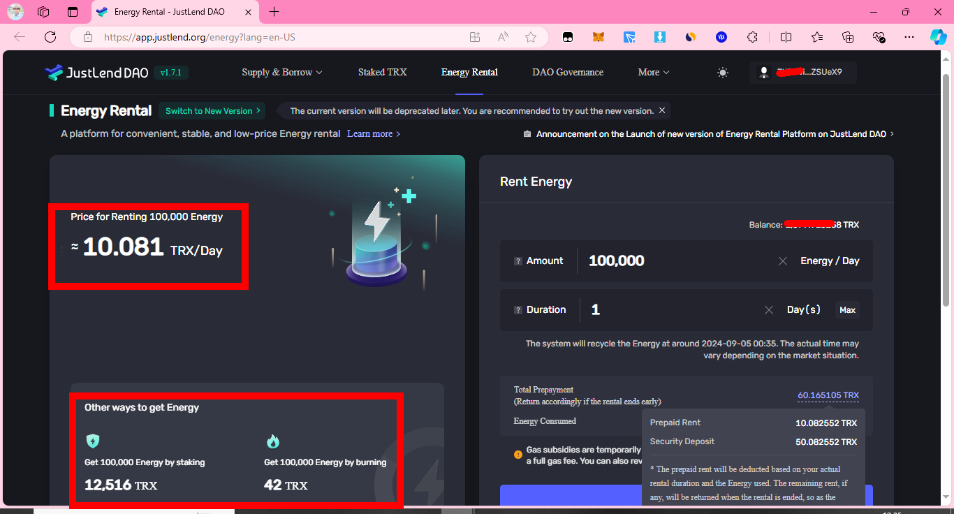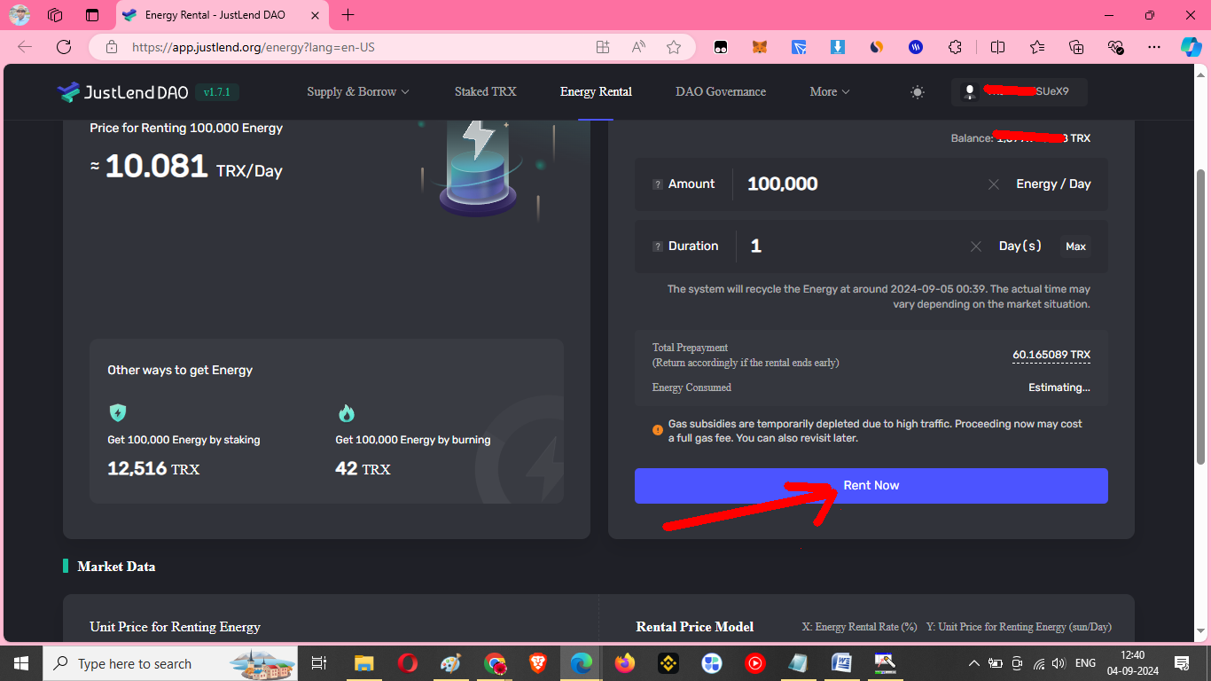 ✔এখন এনার্জি রেন্টাল করার জন্য প্রাইস প্যাক চয়েস করতে হবে। এখানে দেখুন 100,000 এনার্জি রেন্ট নিতে গেলে আপনার পার ডে 10.071 TRX পড়বে। আপনি চাইলে 100,000 এর বেশিও নিতে পারেন এবং সেটা আপনি 1 দিনের জন্যও নিতে পারেন আবার সর্বোচ্চ 30 দিনের জন্যও নিতে পারেন। Prepaid Rent 10.072976 TRX & Security Deposit 50.072976 TRX মিলিয়ে টোটাল ৬০ TRX এর মতো পড়বে। এছাড়া আপনি অন্য উপায়ে যেমন স্টেকিং এবং বার্নিং এর মাধ্যমেও করতে পারেন।